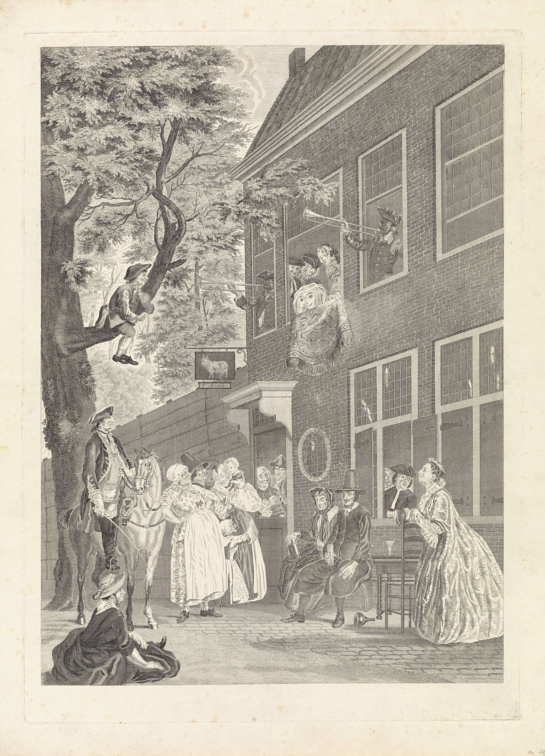 De misleyden: de ambassadeur der Labberlotten vertoont zich voor het venster van de herberg 't Bokki in de Haarlemmerhout (een grap bedreven door Jacob Campo Weyerman en consorten). Een groep mensen kijkt naar het als een gezicht beschilderde achterwerk van een man, uit het venster van de herberg gestoken. Aan weerszijden twee trompetters met zwart ...