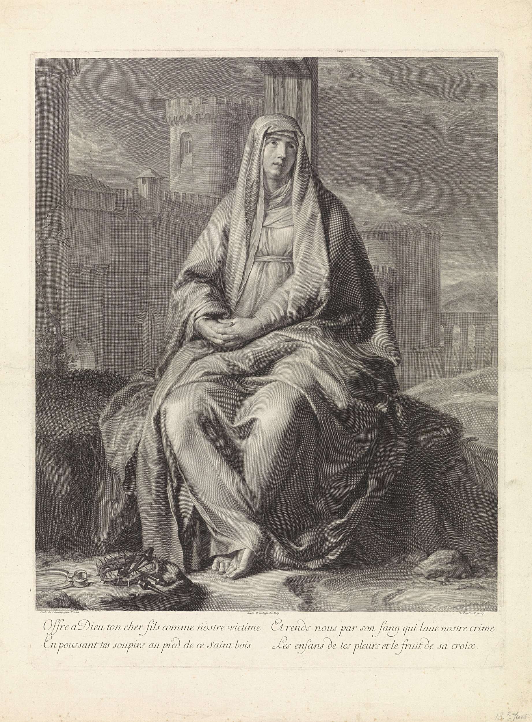 Maria, huilend en met gevouwen handen, zit tegen de onderkant van het kruis van Christus. Bij haar voeten liggen passiewerktuigen: een nijptang, spijkers en de doornenkroon. Op de achtergrond een stadmuur. Onder de voorstelling een Latijns vers van twee keer twee regels.