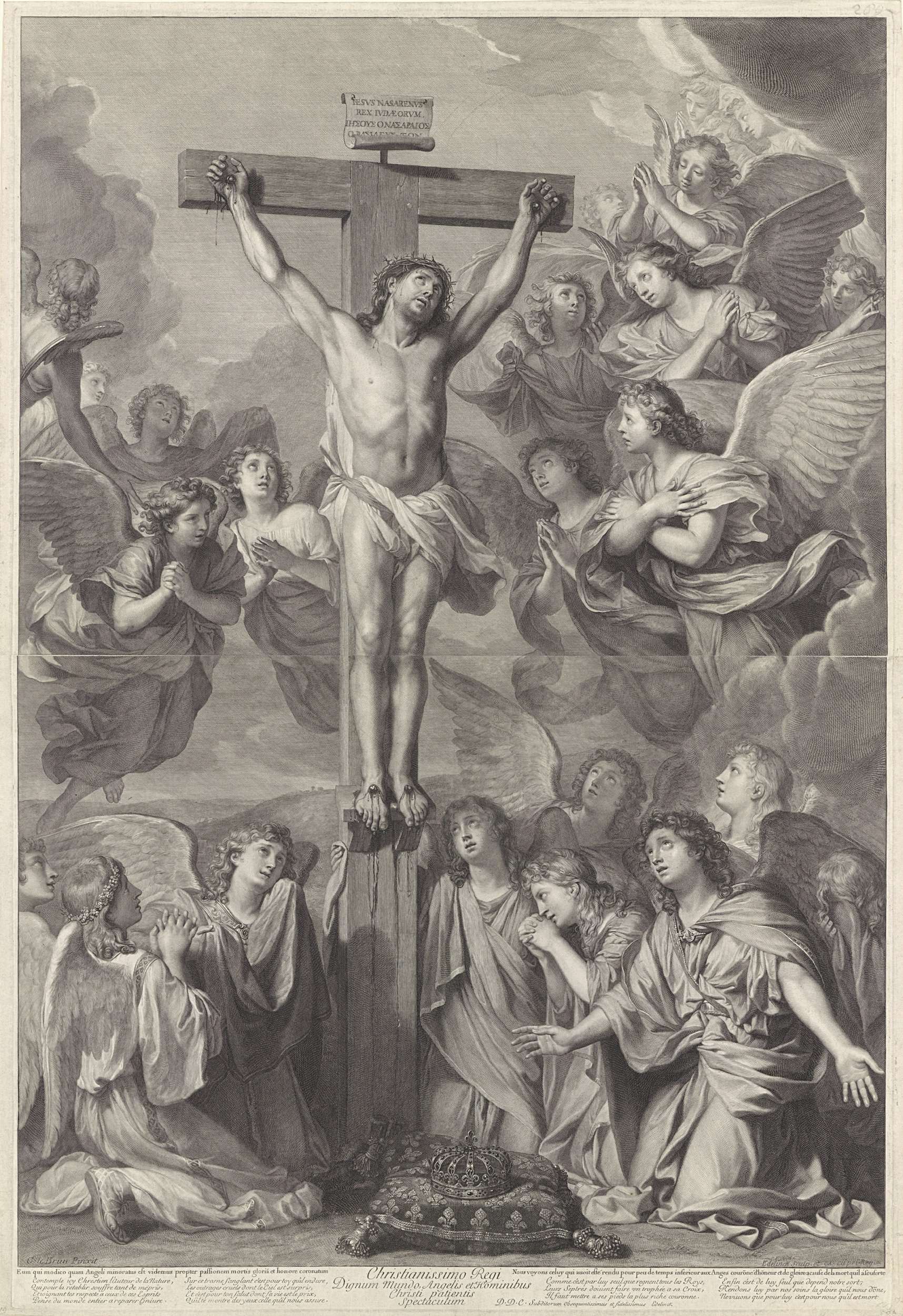 Een prent in twee delen, voorstellende Christus aan het kruis, omringd door engelen. Op de voorgrond, op een kussen, de Franse kroon. Onder de voorstelling een opschrift in Latijn en in Frans.