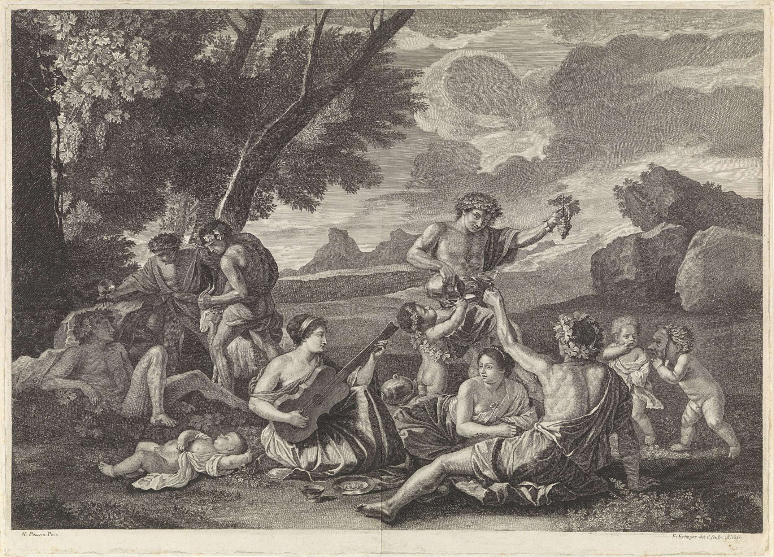 Een groep mannen, vrouwen en kinderen in een berglandschap. Een man met een tros druiven in zijn hand schenkt de kelk van een jongentje in, terwijl een zittende man zijn glas bij houdt. Een vrouw speelt gitaar naast een slapend kind en op de achtergrond houdt een man een bok bij de horens vast.