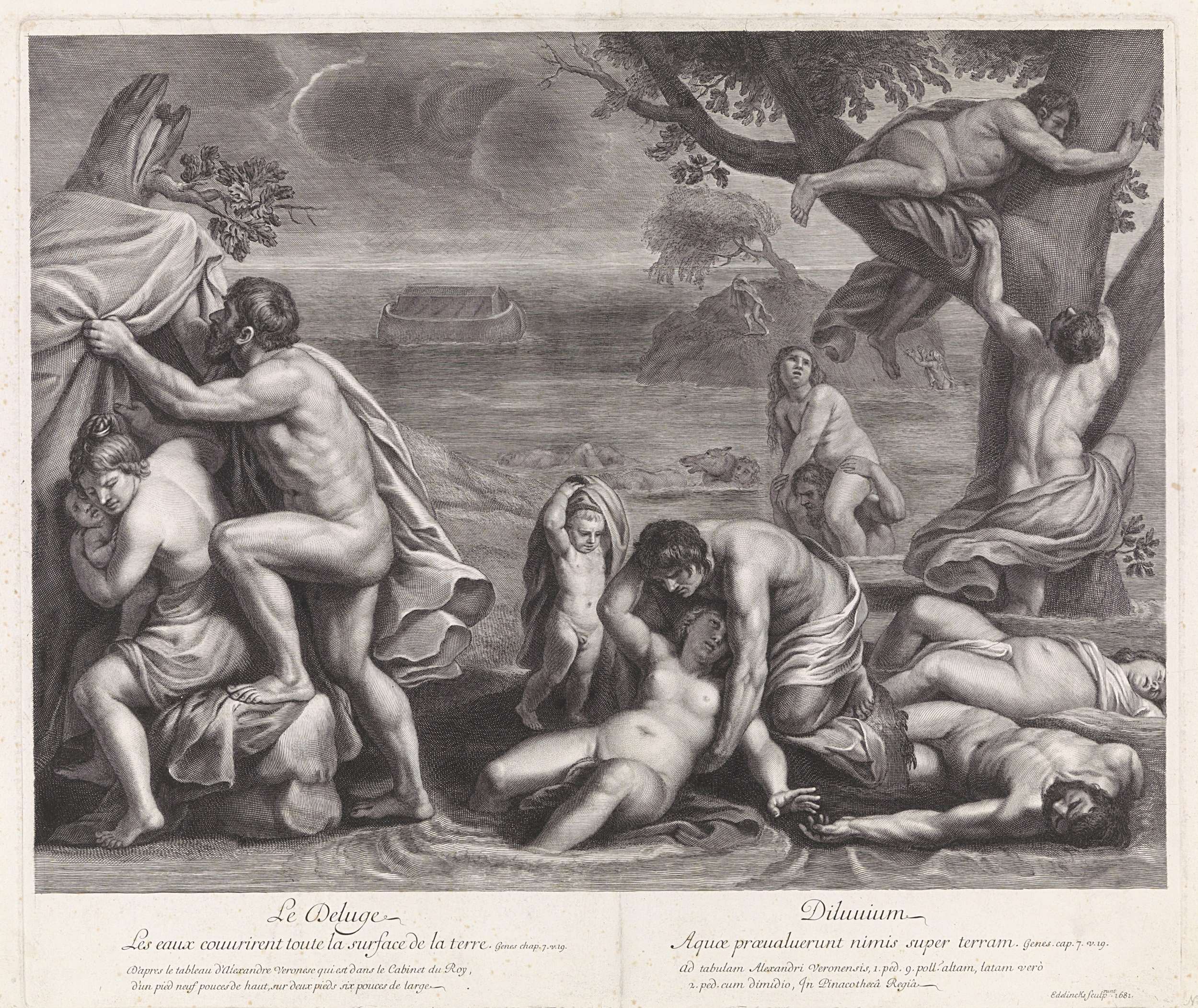 Naakte mannen, vrouwen en kinderen proberen aan het stromende water te ontkomen door in een boom of op hoger gelegen delen te klimmen. Enkelen liggen levenloos in het water. Op de achtergrond vaart de ark van Noach. Onder de voorstelling vier regels in het Frans en vier in Latijn.