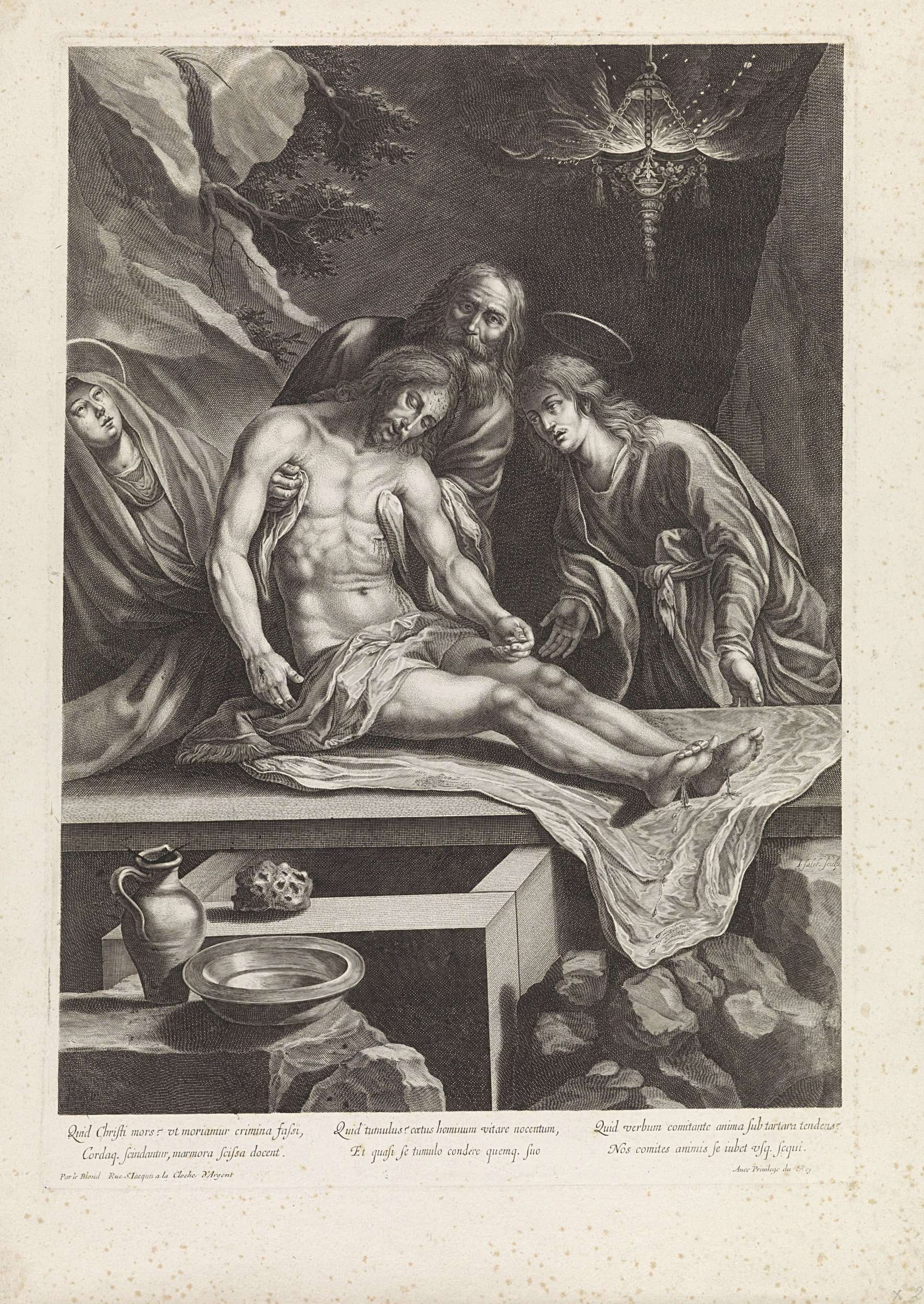 Jozef van Arimatea legt het lichaam van Christus op een tafel in het bijzijn van de twee Maria`s. Op de voorgrond een kan, een schaal en een spons. Onder de voorstelling een opschrift in Latijn.