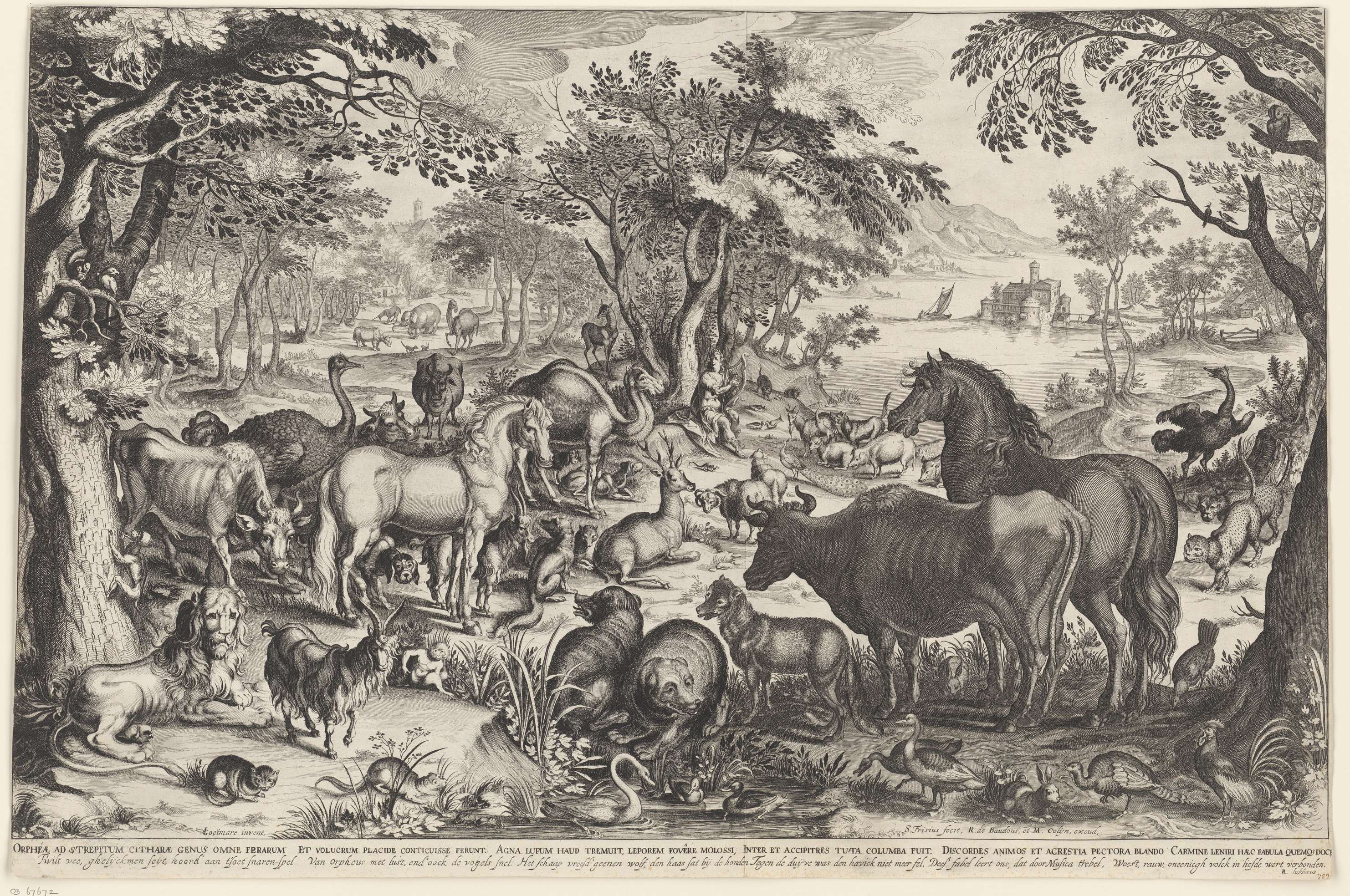 Orpheus zit onder een boom in het midden van een landschap en tokkelt op zijn lier. Allerlei dieren, wilde en tamme, zitten vreedzaam om hem heen. In de marge onder de prent staan twee regels tekst in het Latijn en Nederlands.