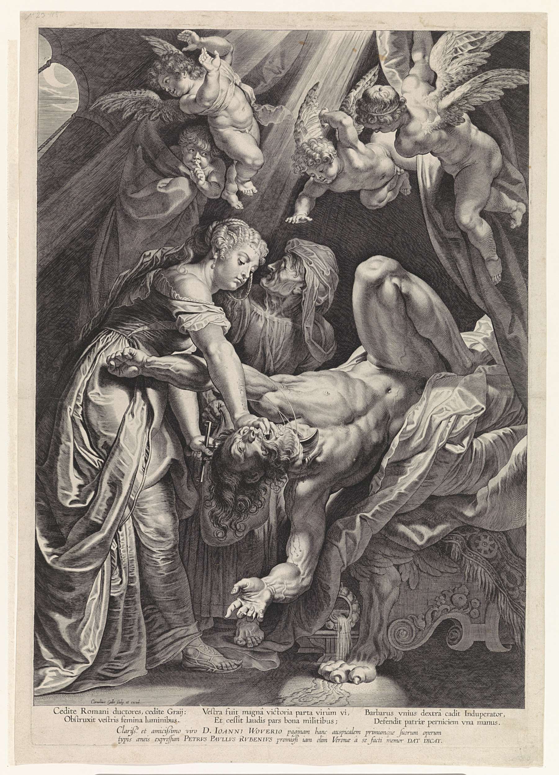 Judit onthoofdt Holofernes in de legertent. Op de achtergrond Judits bediende en in de lucht engelen.