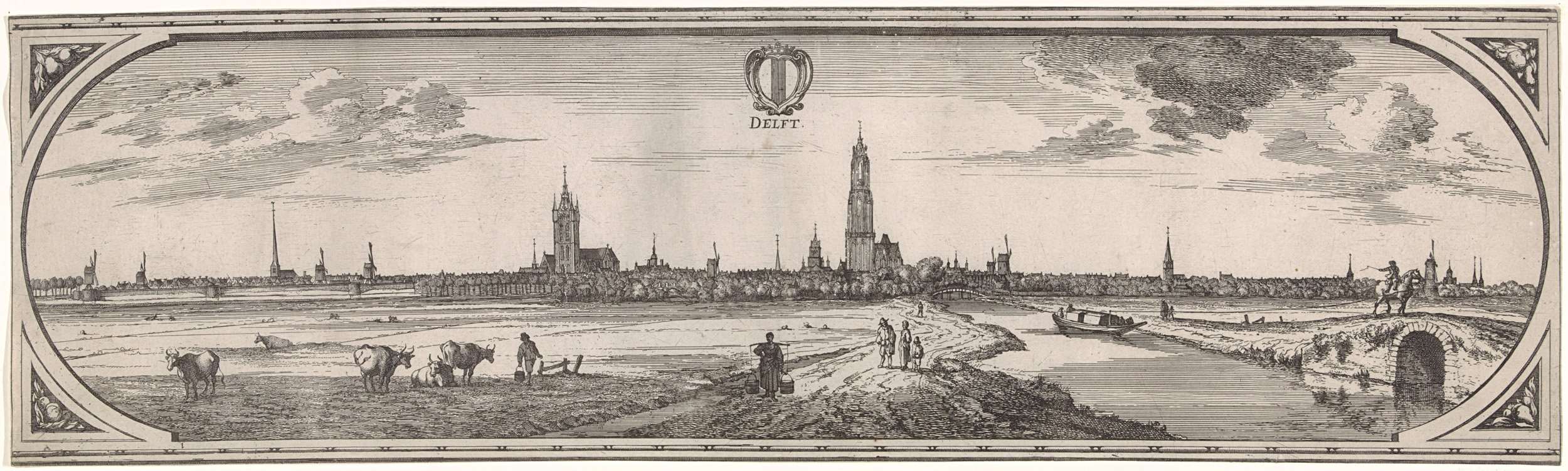 Gezicht op Delft gezien vanaf de Delftse Schie. In het midden de Nieuwe Kerk en links de Oude Kerk. Boven in het midden het wapen van de stad en de titel.
