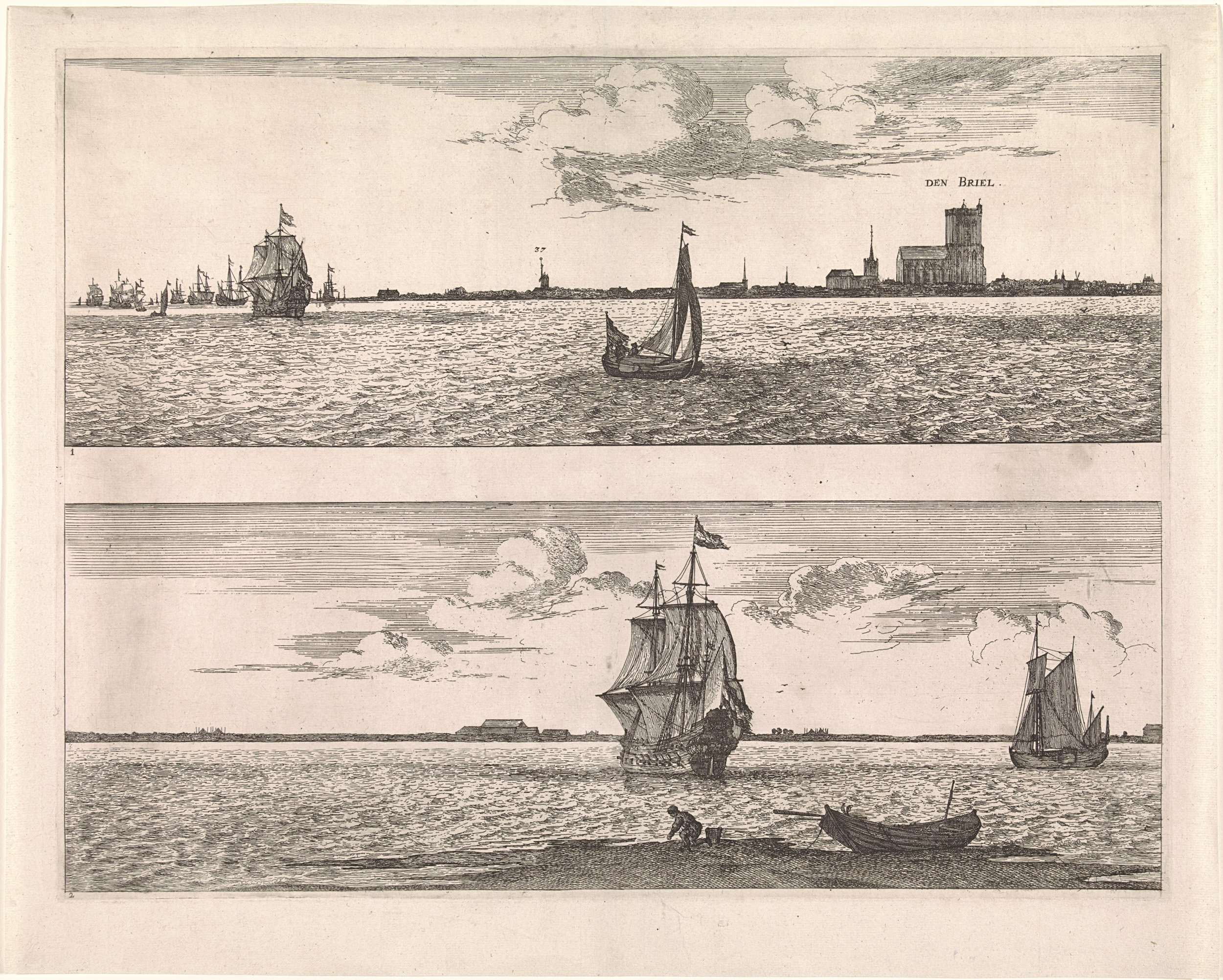 Gezicht op de westkant van de Maas met op de achtergrond de stad Brielle (Den Briel), genummerd 1. Daaronder Gezicht op de westkant van de Maas, genummerd 2.