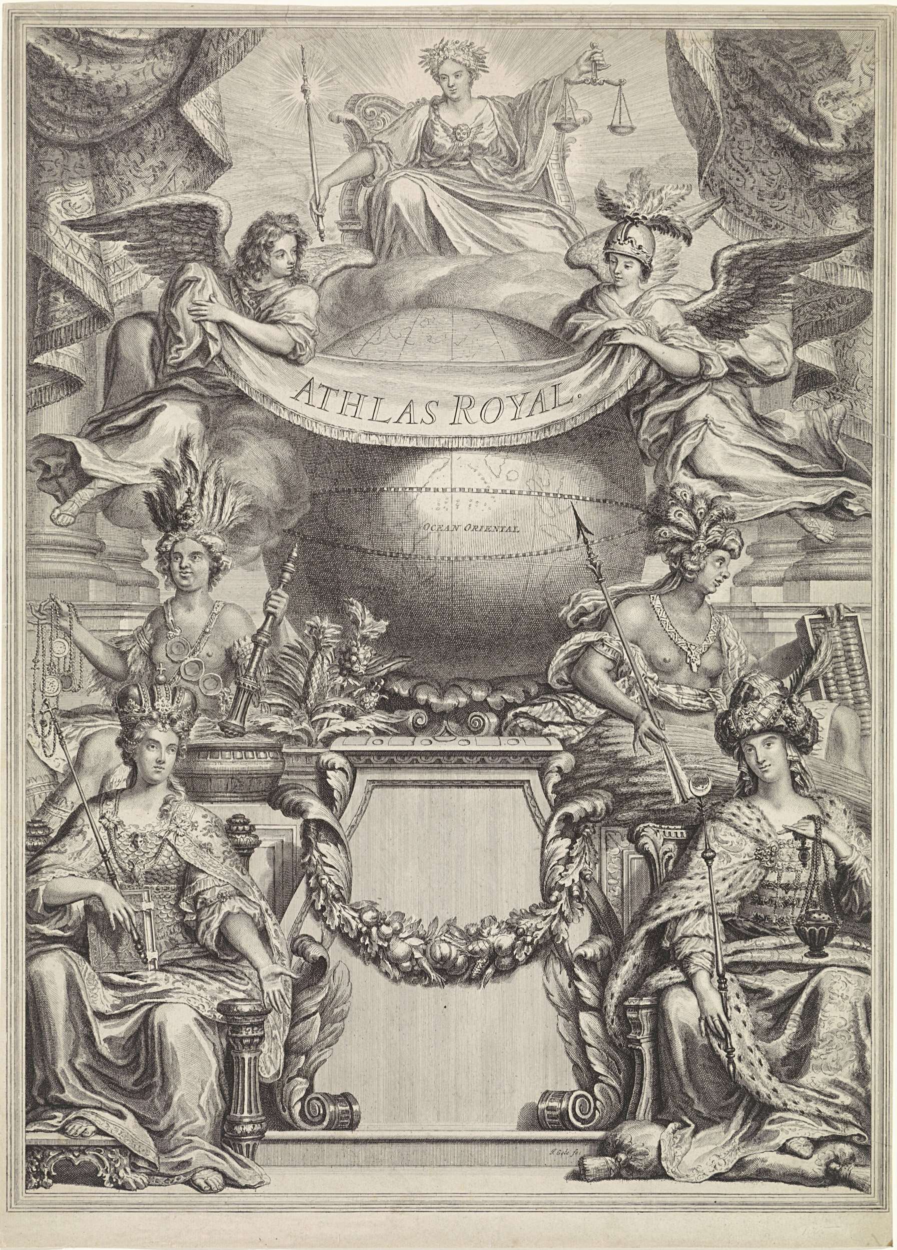 Boven: de personificatie Rechtvaardigheid, zittend op een troon. Onder haar de wereldbol op een sokkel met in het midden de Indische Oceaan. Aan weerszijden van de sokkel een engel. Samen houden ze een draperie omhoog met de titel van het boekwerk. Op de voorgrond de vrouwelijke personificaties van de vier werelddelen: Links Europa en Afrika, ...