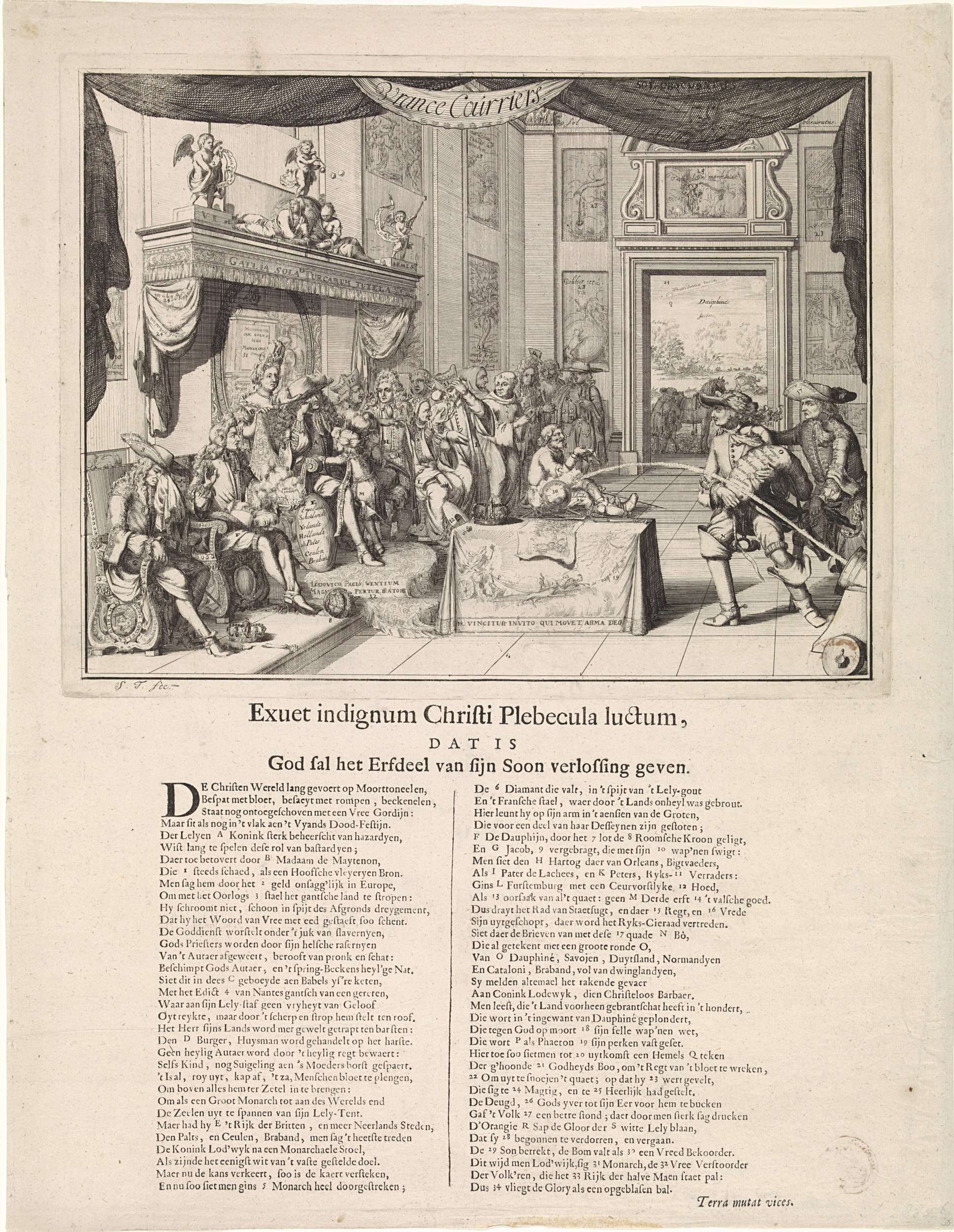 Spotprent op de treurige staat van Frankrijk onder het bewind van koning Lodewijk XIV, 1692. In de troonzaal zit Lodewijk XIV treurig op zijn troon. Links de huilende Jacobus II en de Grand Dauphin, achter de koning staat zijn echtgenote Madame de Maintenon. Rechts twee jezuïeten waaronder pater Peters, Wilhelm Egon von Fürstenberg en anderen. ...