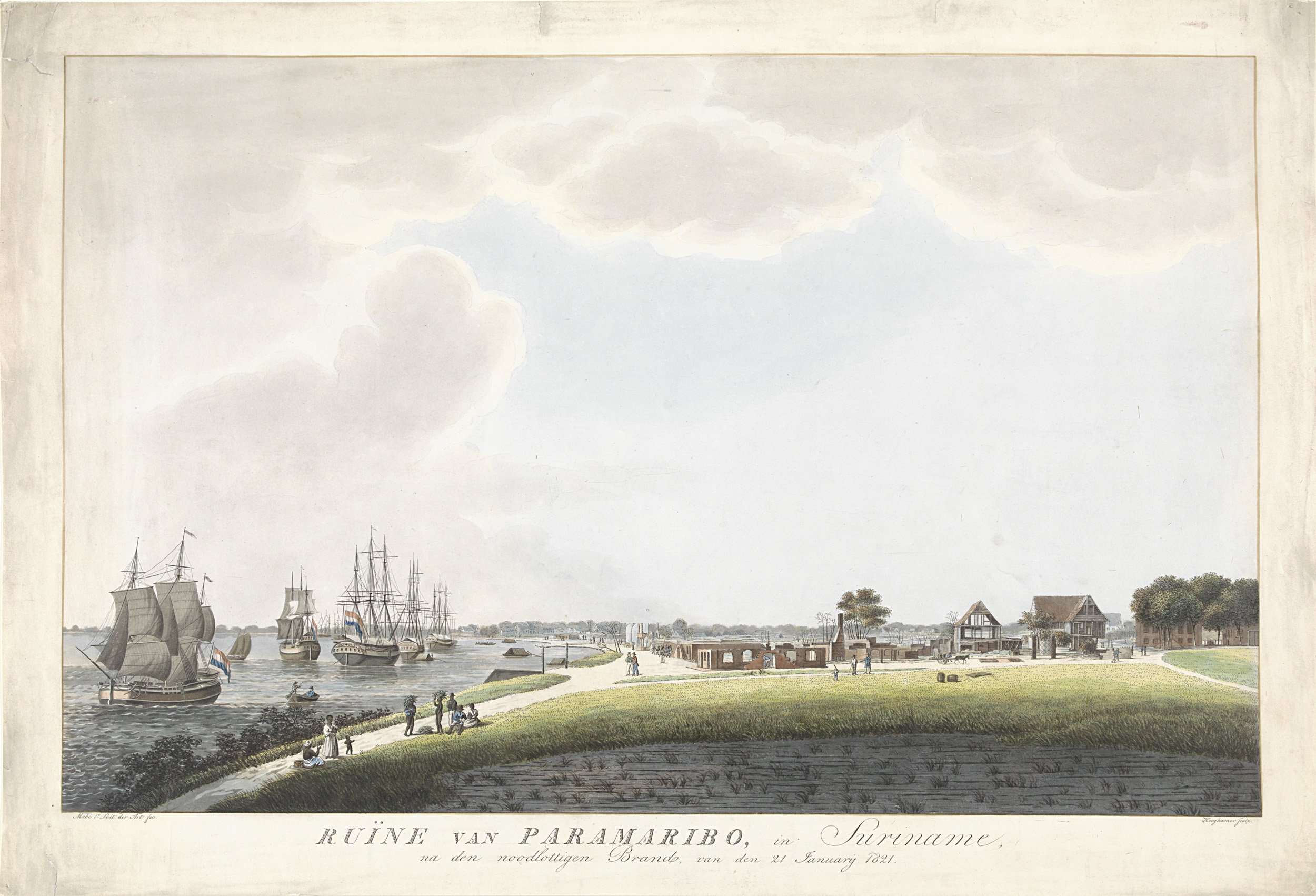 Gezicht op uitgebrande huizen in Paramaribo na de grote brand van 21 januari 1821. Links enkele zeilschepen en converserende figuren.
