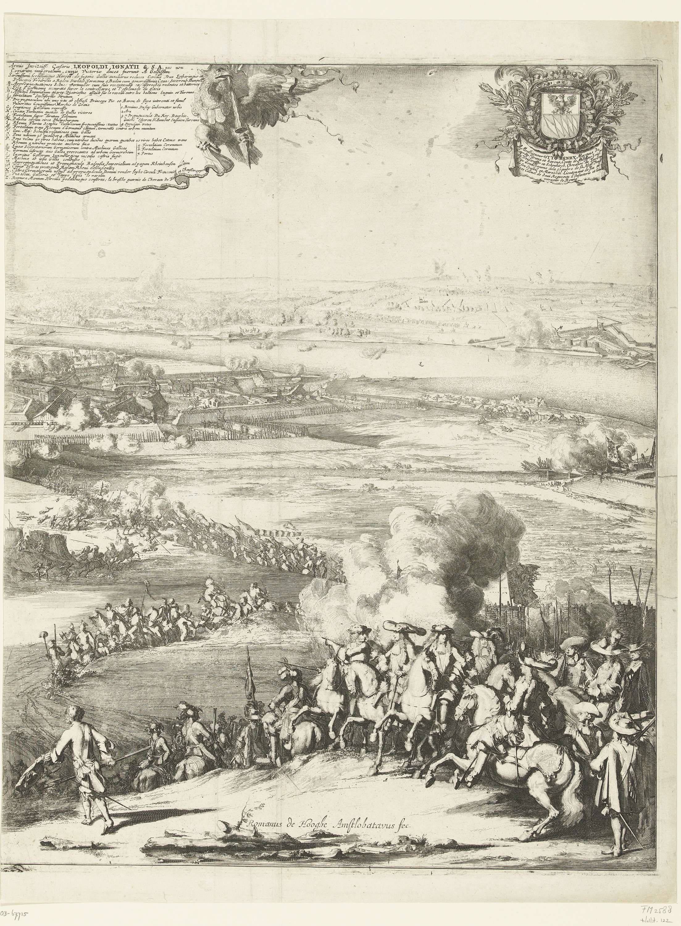 Rechterblad van een grote voorstelling van het beleg en de verovering van Philippsburg door de troepen van keizer Leopold I op 17 september 1676, op 2 bladen. Gezicht op het gebied rechts van de belegerde stad. Op de voorgrond de bevelhebbers, Karel van Lotharingen en Hendrik van Baden-Durlach. Rechtsboven een doek met een Franse tekst, ...