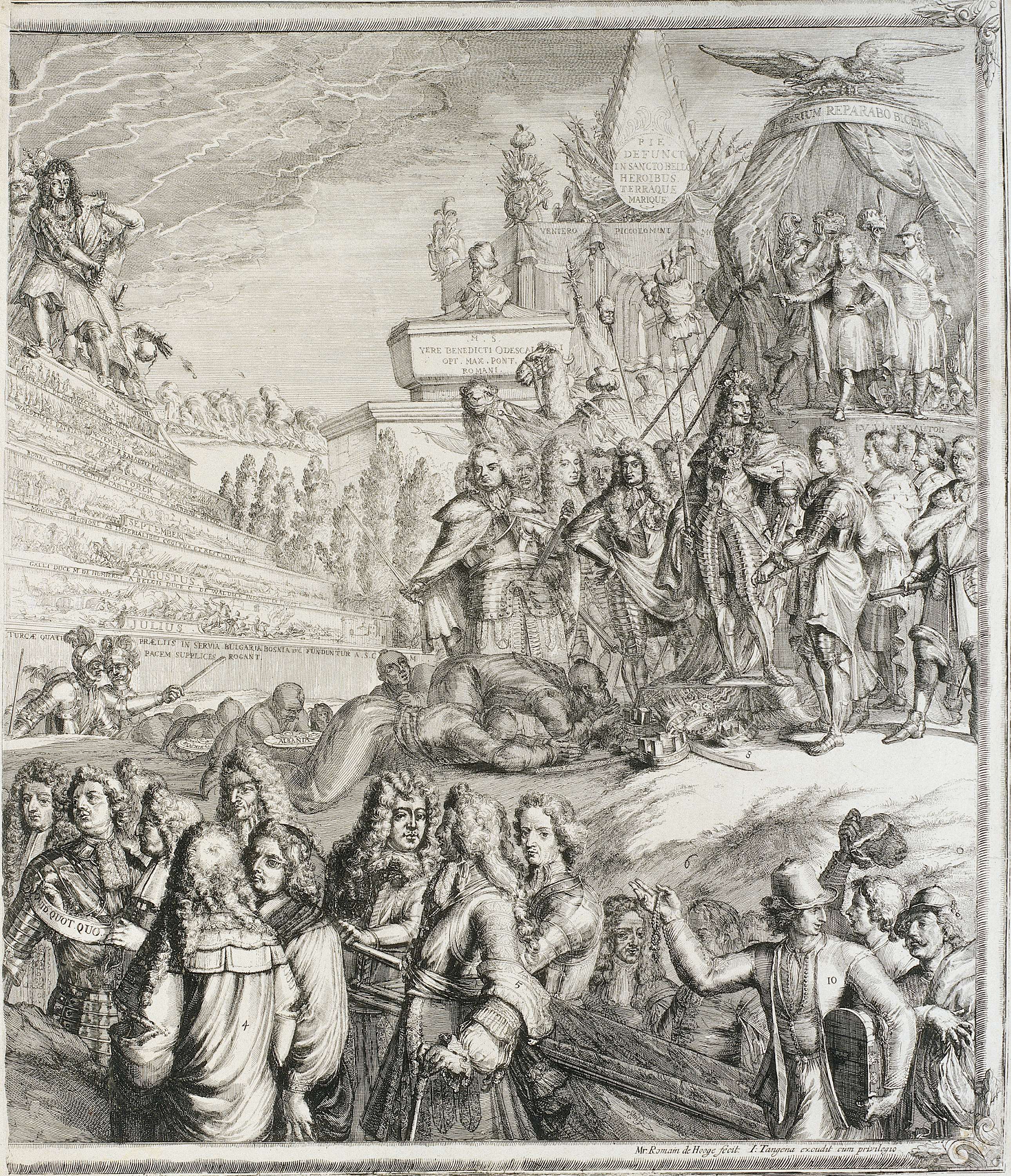 Allegorie op de gebeurtenissen in 1689 met de stadhouder-koning Willem III en koningin Maria op de troon. Rechter helft van twee bladen die samen één voorstelling vormen. Op de voorgrond legeraanvoerders en rechts Hollandse matrozen. Hierachter knielen overwonnen Turken voor keizer Leopold I, staande tussen vorsten. Hierboven de kroning van Jozef I tot koning van ...