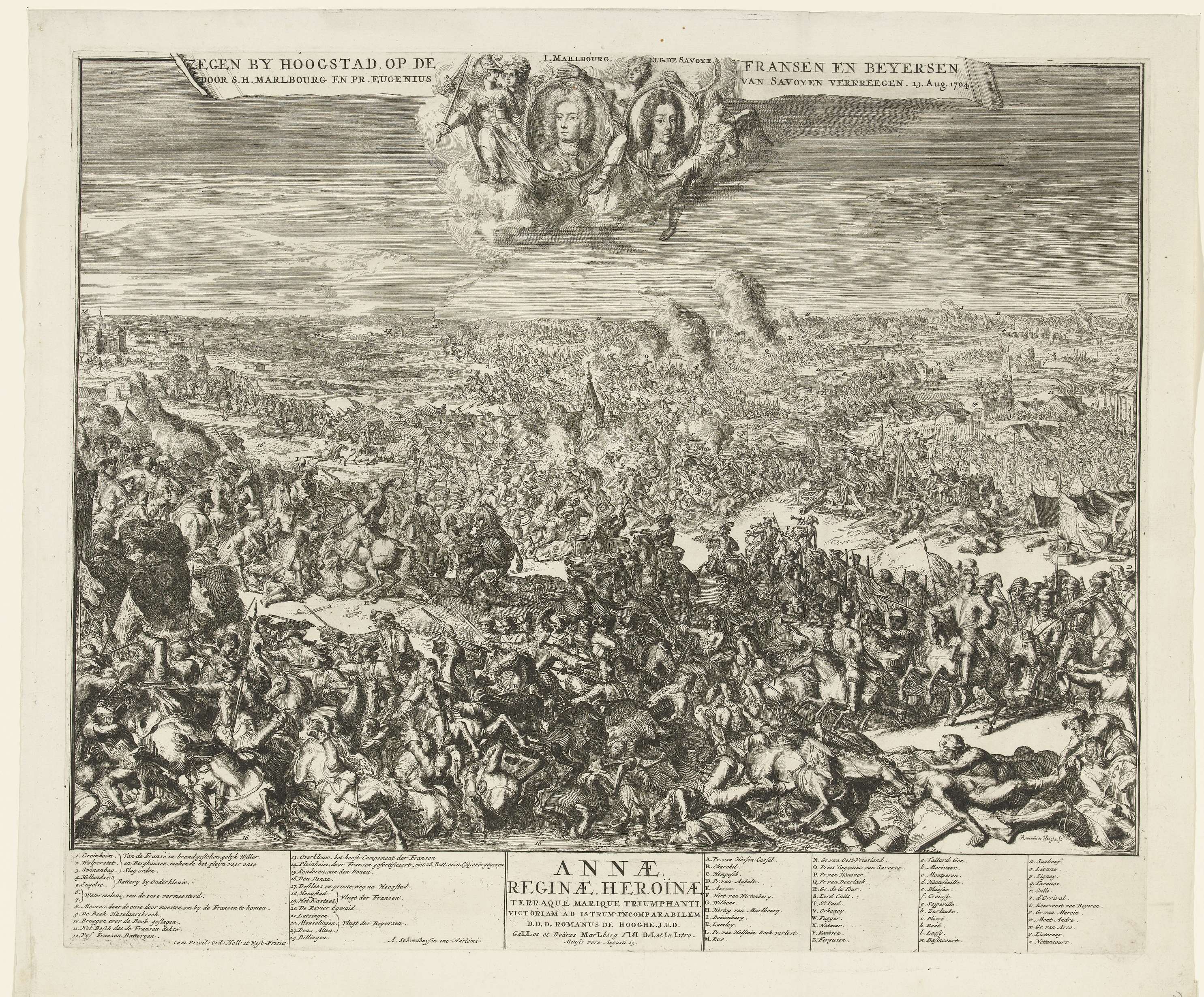 Slag bij Höchstädt, bij Blenheim, in Beieren op 13 augustus 1704. Overwinning van de geallieerde troepen onder de hertog van Marlborough en de prins van Savoye, wier portretten bovenaan de voorstelling staan, op de Franse en Beierse troepen. In het onderschrift de legenda's 1-24 en A-z.