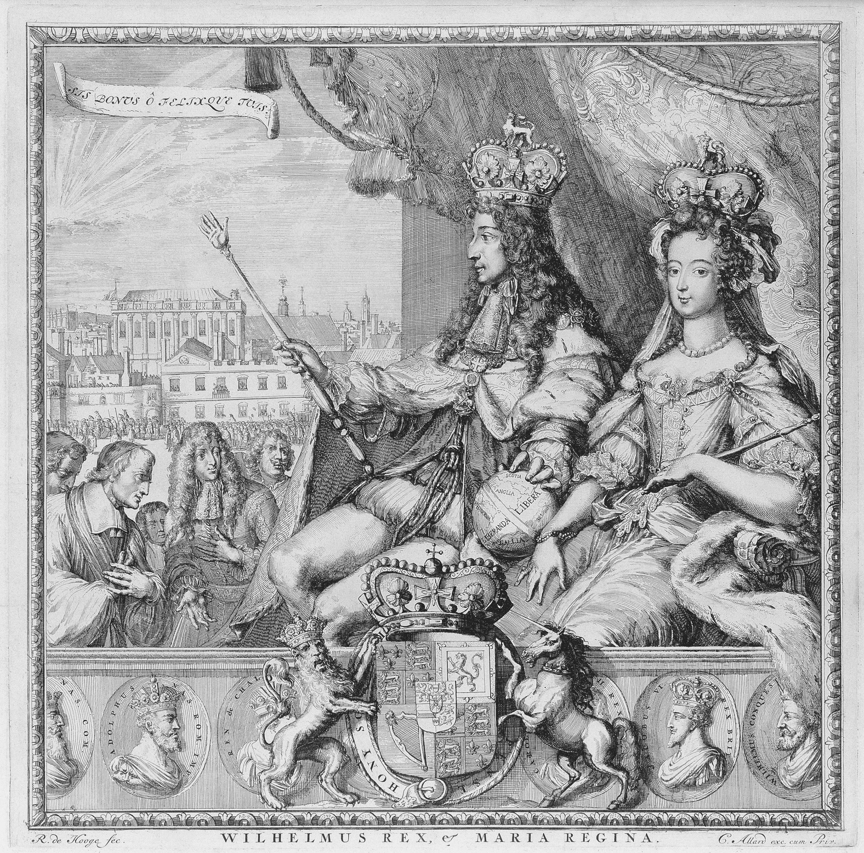Allegorie op de kroning van Willem en Maria als koning en koningin van Groot-Brittannië, 21 april 1689. Het echtpaar zittend voor een gedrapeerd gordijn, scepters in de hand. Links enkele toeschouwers, op de achtergrond het paleis van Whitehall te Londen. Onderaan het wapen van Groot-Brittannië en medaillons met portretten van eerdere Engelse koningen.