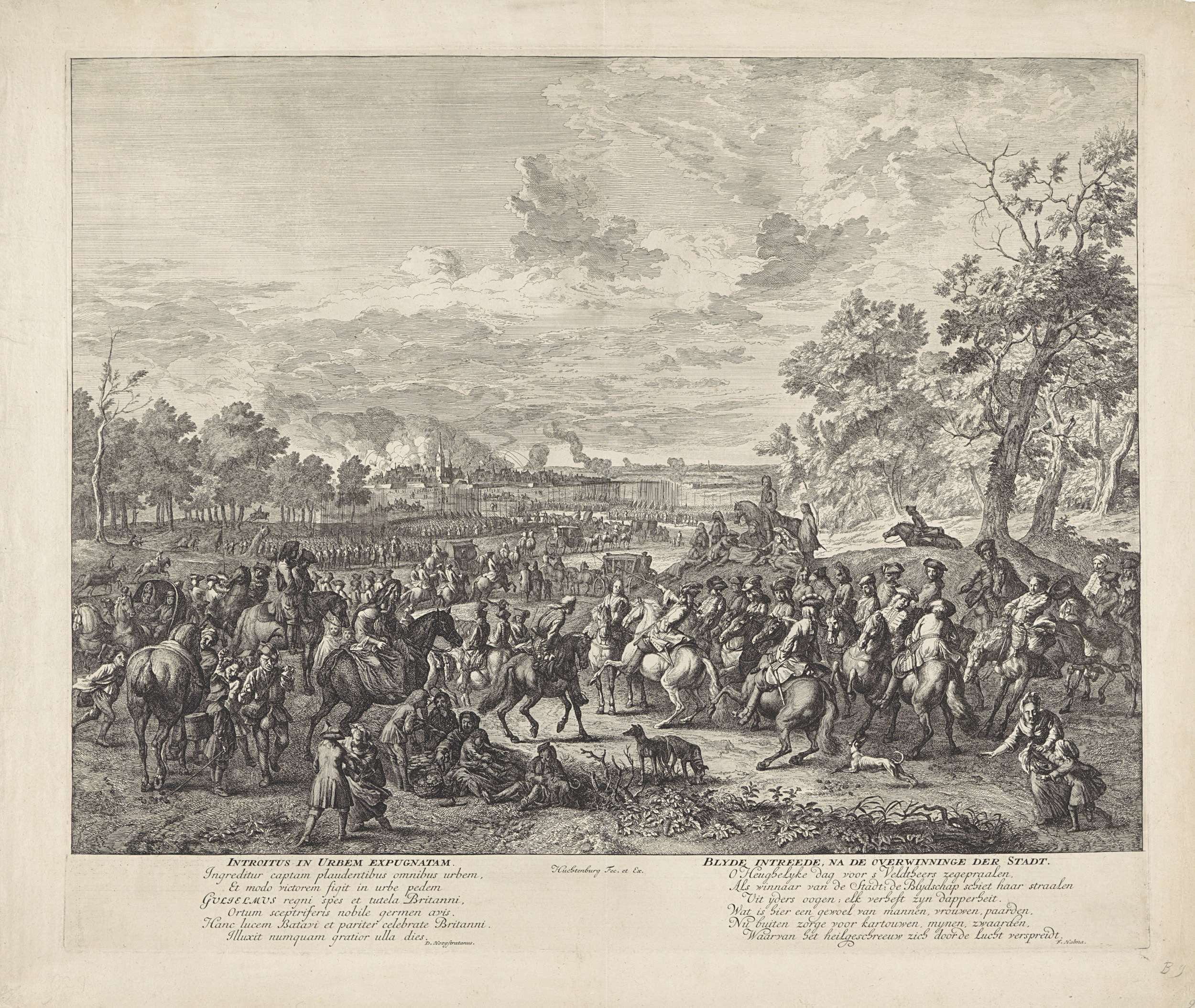 De legers van geallieerden maken zich gereed om op 4 augustus 1695 de veroverde stad Namen binnen te trekken. In de verte gaan de beschietingen van de citadel nog door. Op de voorgrond vrouwen, kinderen en honden. Onderaan in de marge een zesregelige tekst in het Latijn en een zesregelige tekst in het Nederlands.