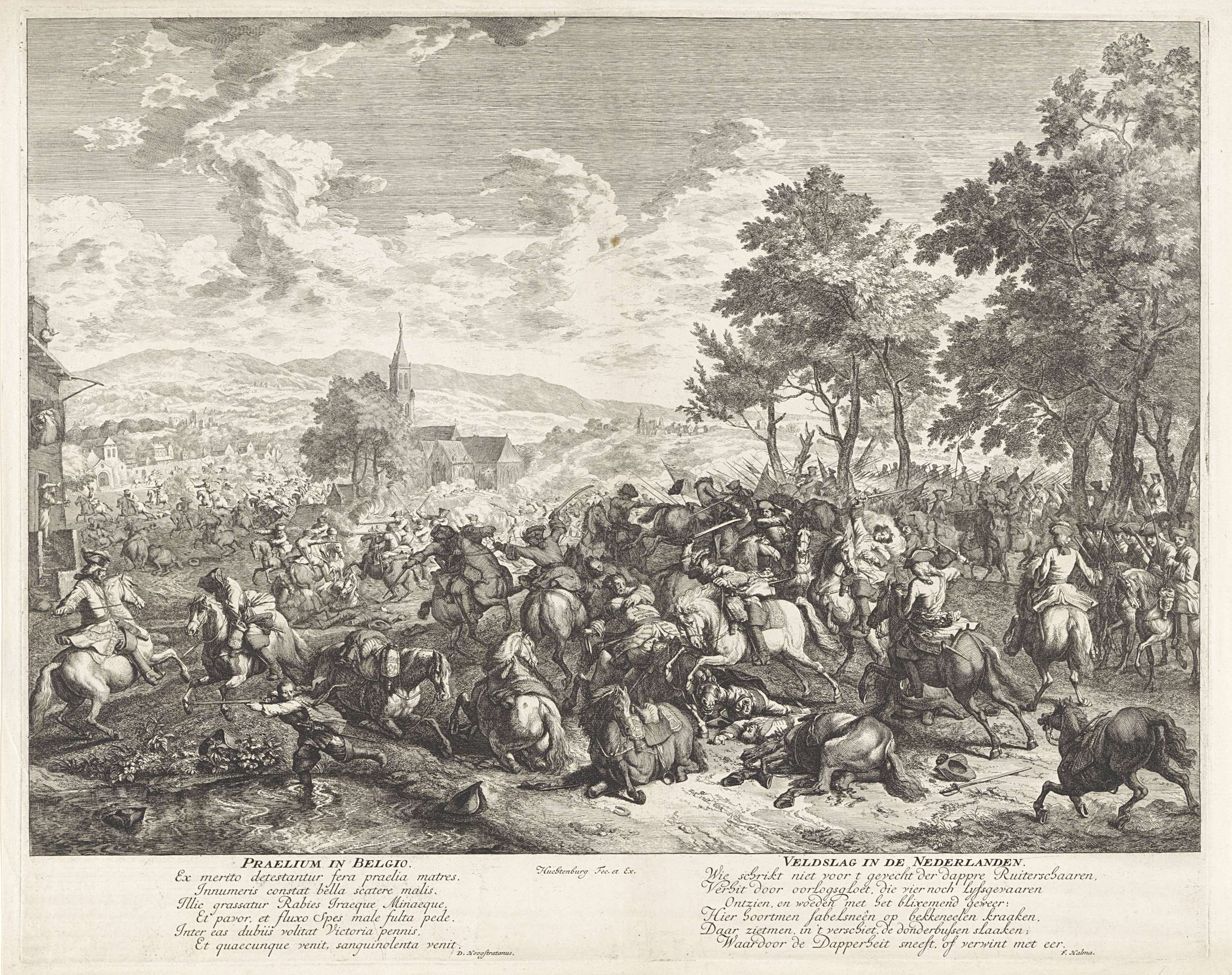 Gezicht op een woest ruitergevecht in de Nederlanden, ten tijde van de Spaanse Successieoorlog, ca. 1702. Op de achtergrond een kerk. Onderaan in de marge een zesregelige tekst in het Latijn en een zesregelige tekst in het Nerderlands.