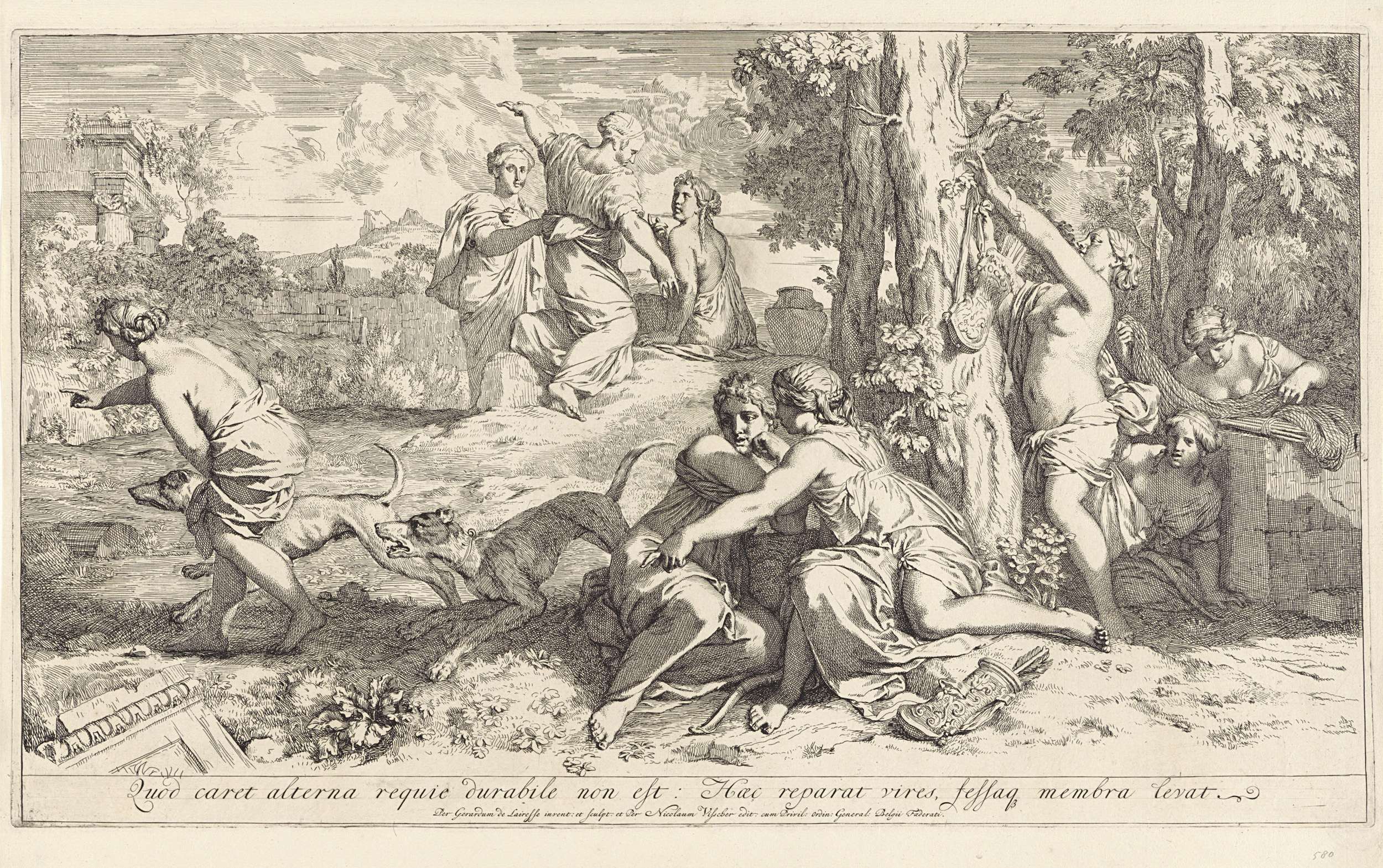 In een landschap rust een groep nimfen uit na de jacht. De jachthonden worden weggestuurd, de pijlen worden opgeborgen of weggehangen. Links zicht op een ruïne.
