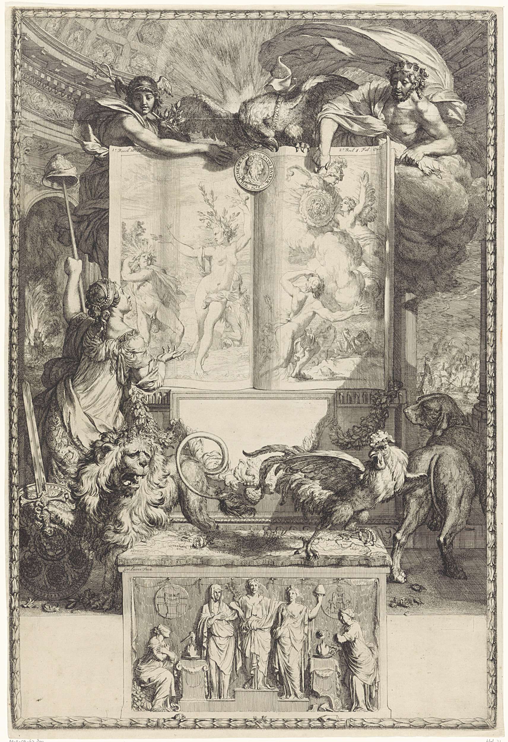 Grote allegorische voorstelling op de overwinning van de Republiek onder het leiderschap van Willem III in 1674. Door middel van twee verhalen uit de Griekse mythologie wordt de overwinning van de Verenigde Nederlanden op haar vijanden onder het leiderschap van prins Willem III (Vrede van Westminster, 19 februari 1674) verheerlijkt. Mercurius en Jupiter wijzen de ...