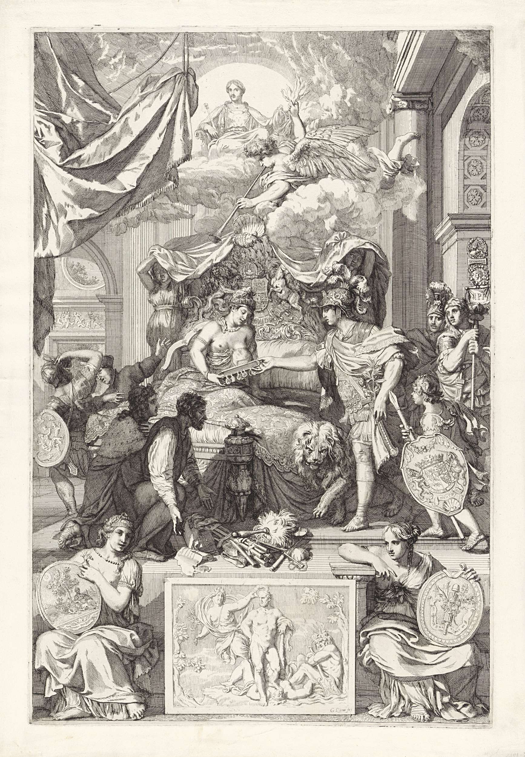 Allegorie op het herstel van de ware godsdienst in Engeland met de komst van de prins van Oranje, 1688. Een Romeins veldheer, Willem III, overhandigt een verzegelde bijbel aan de in bed gelegen Engelse Maagd. Willem III wordt vergezeld door de Hollandse Leeuw, aan het voeteneind knielen de Engelse lord en burger. In de lucht ...
