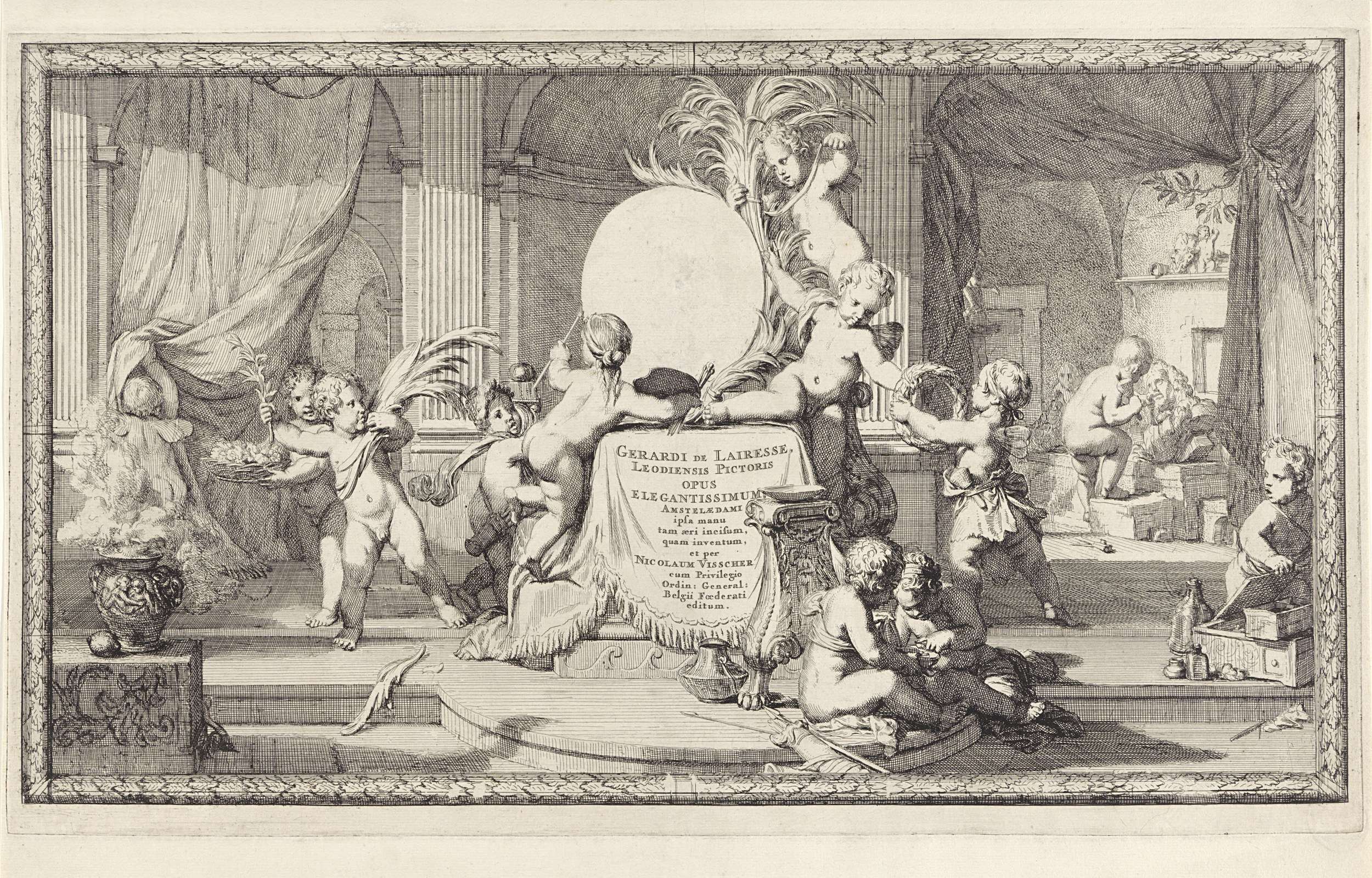 Putti versieren een met kleed bedekt voetstuk met palmtakken, lauwerkransen en bloemen. Bovenop is een ovaal geplaatst. Rechts op de achtergrond beitelt een putto in een atelier een buste.