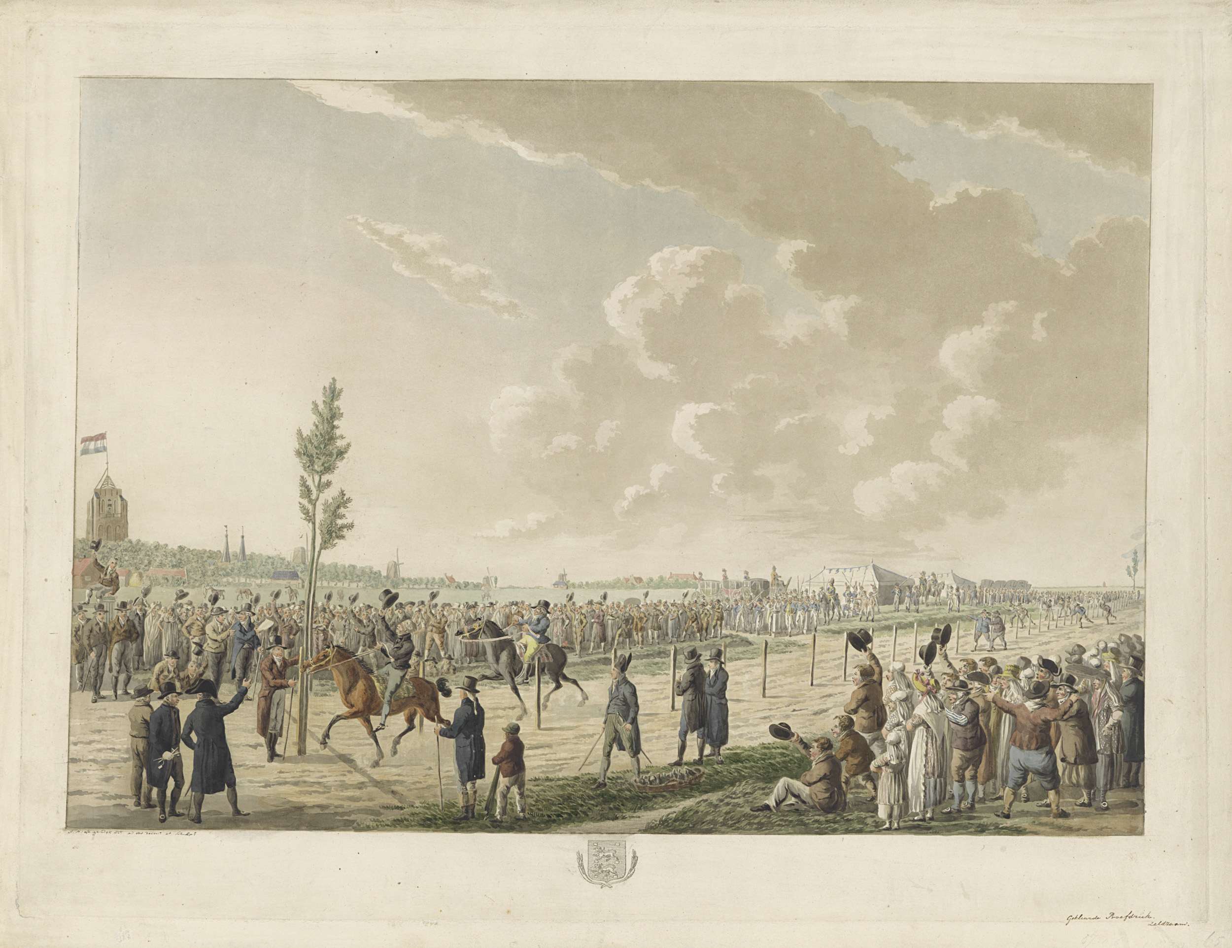Paardenraces op een vlakte buiten de stad Leeuwarden, met veel publiek aan weerszijden van de baan, 2 september 1808. In de marge het wapenschild van Friesland.