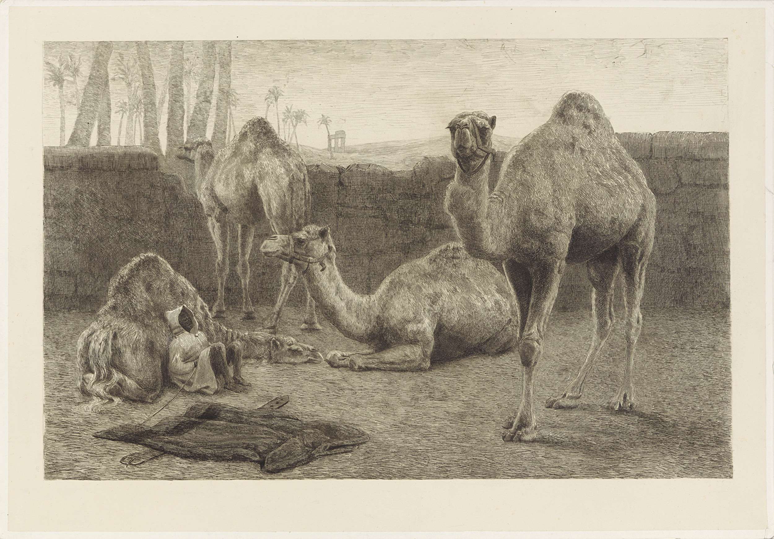 Vier kamelen binnen stenen muren in de buitenlucht. Een jonge kamelendrijver leunt met zijn rug tegen een op de grond gelegen kameel. In de verte een uitgestrekte vlakte met enkele palmbomen.