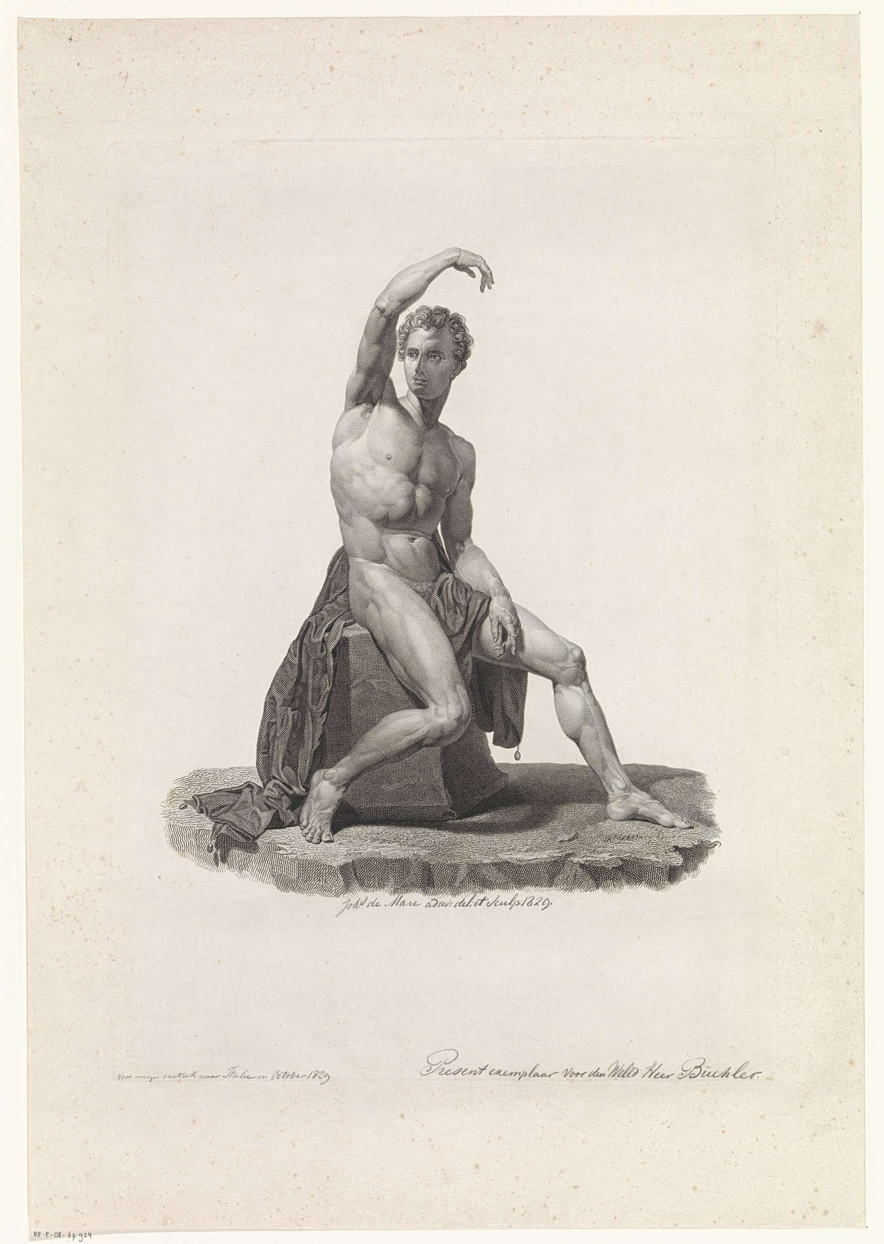 Zittend mannelijk naakt met opgeheven arm.