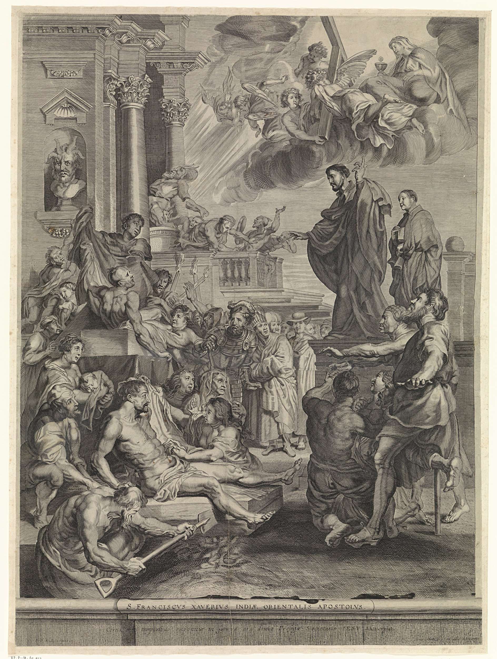 De heilige Franciscus Xaverius wekt een dode tot leven, die opstaat uit zijn sarcofaag. Hij wordt omringd door mensen die om genezing vragen.