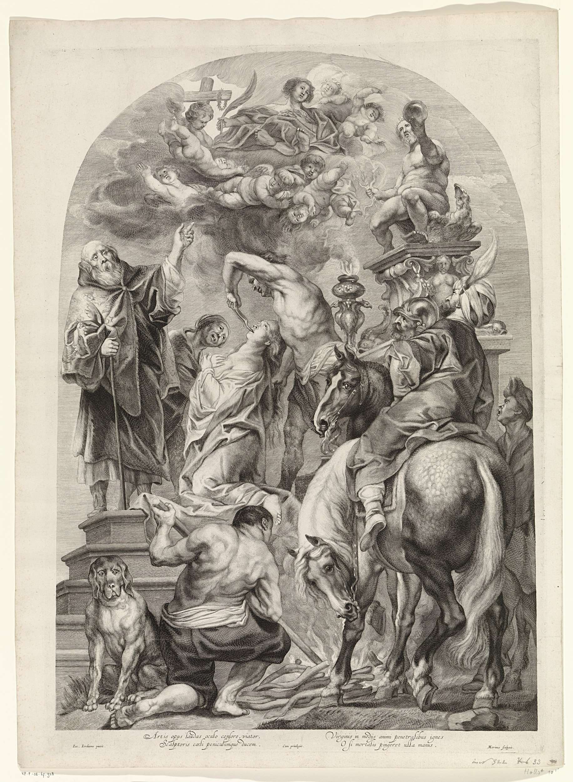 Het martelaarschap van de heilige Apollonia: haar tanden worden uitgetrokken, terwijl op de voorgrond haar brandstapel wordt klaargemaakt.
