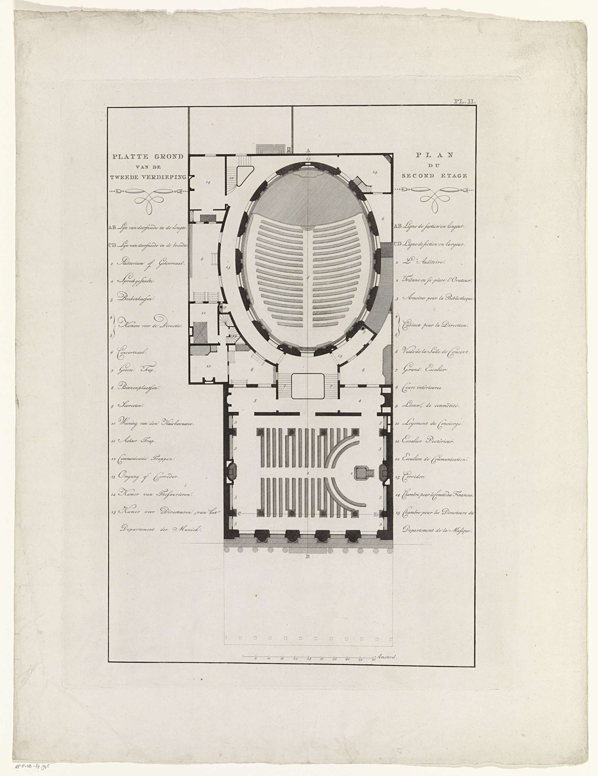 Plattegrond van de tweede verdieping van gebouw Felix Meritis te Amsterdam. Links en rechts een legenda in het Nederlands en Frans. Rechtsboven genummerd: Pl. II.