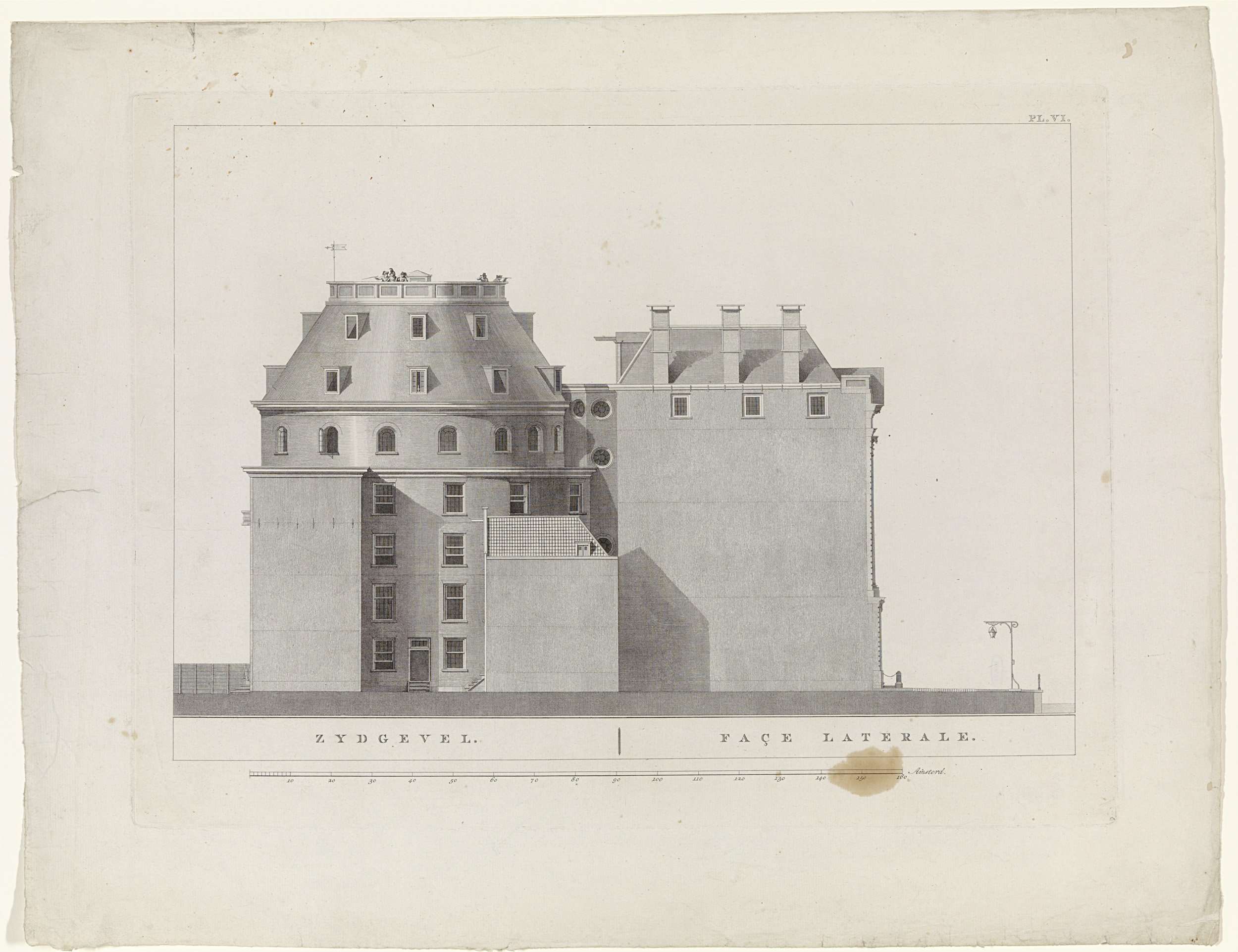 Zijgevel van gebouw Felix Meritis te Amsterdam. Op het dak een windvaan en figuren met verrekijkers. Rechtsboven genummerd: Pl. VI.