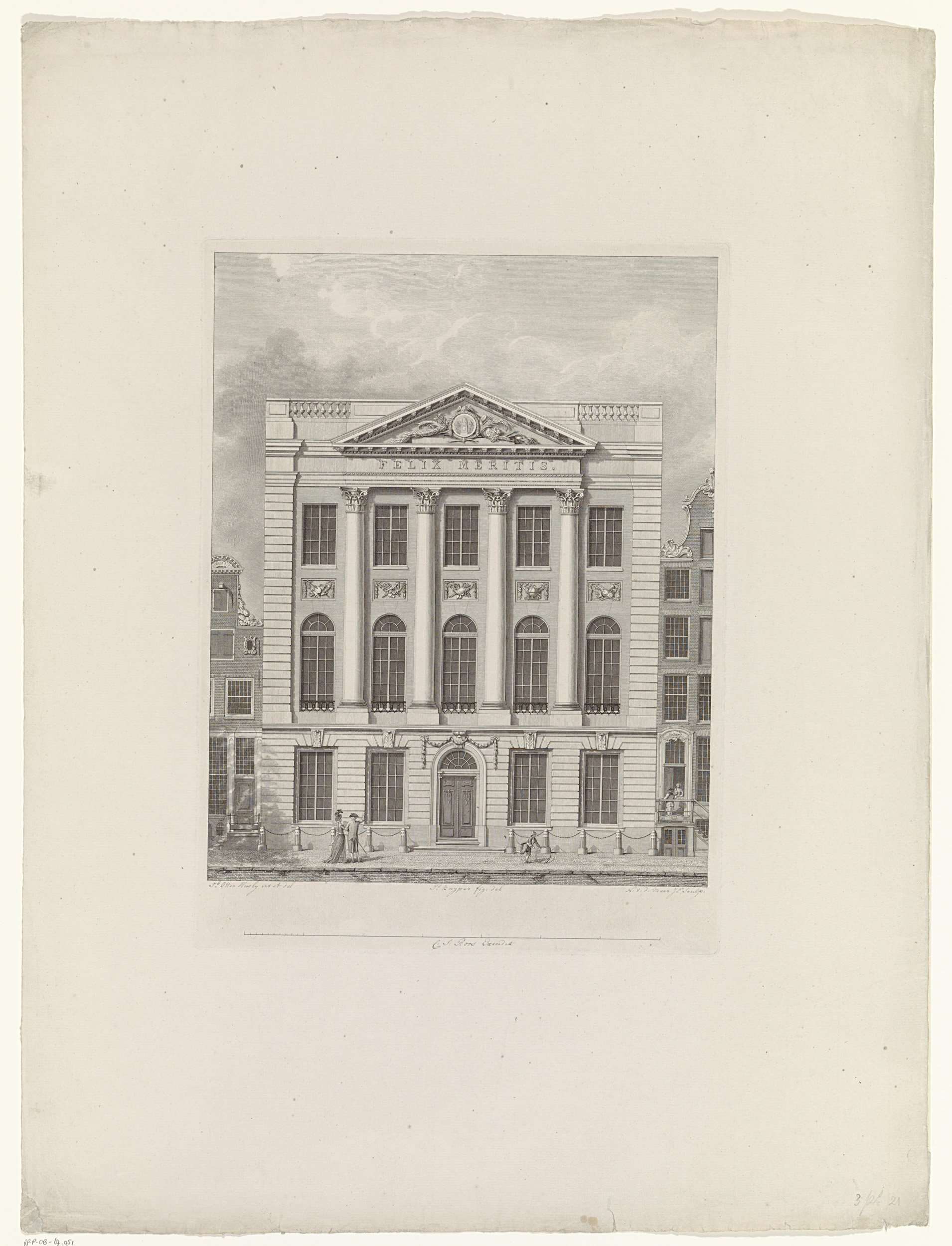 Het gebouw van het genootschap Felix Meritis te Amsterdam, dat in 1788 werd opgericht door gegoede burgers van de stad om de kunsten en wetenschappen te bevorderen. Op het trottoir bewonderen een man en vrouw het gebouw en een jongen speelt met een hoepel.