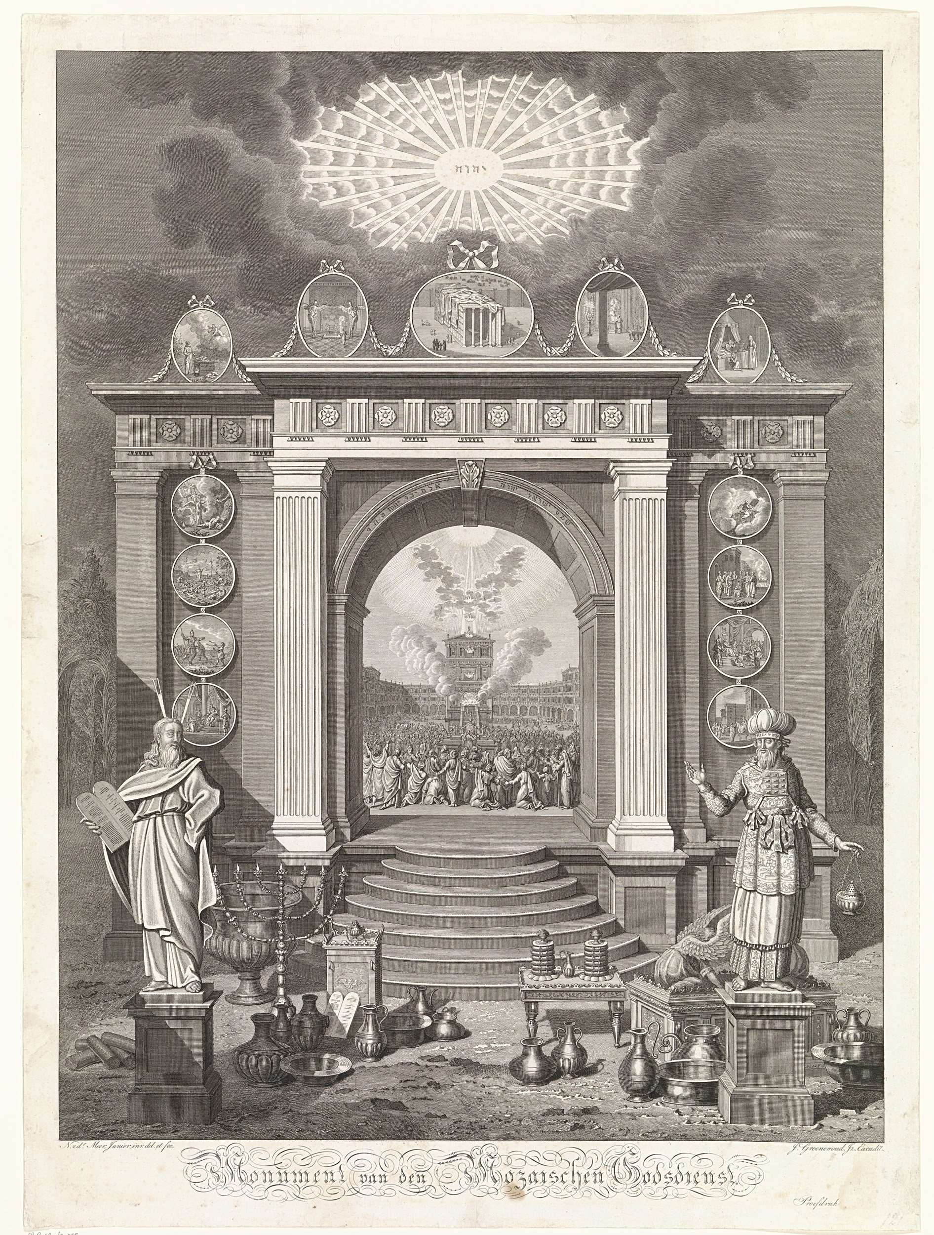 Voor een monumentale poort staan beelden van Mozes en Aäron op sokkels. Op de grond het tempelgerei. Door de poort is de binnenplaats van de tempel van Salomo zichtbaar, waar op het gebed van Salomo vuur van God uit de hemel daalt om het offer te verteren. Op de monumentale poort zijn twaalf genummerde voorstellingen ...