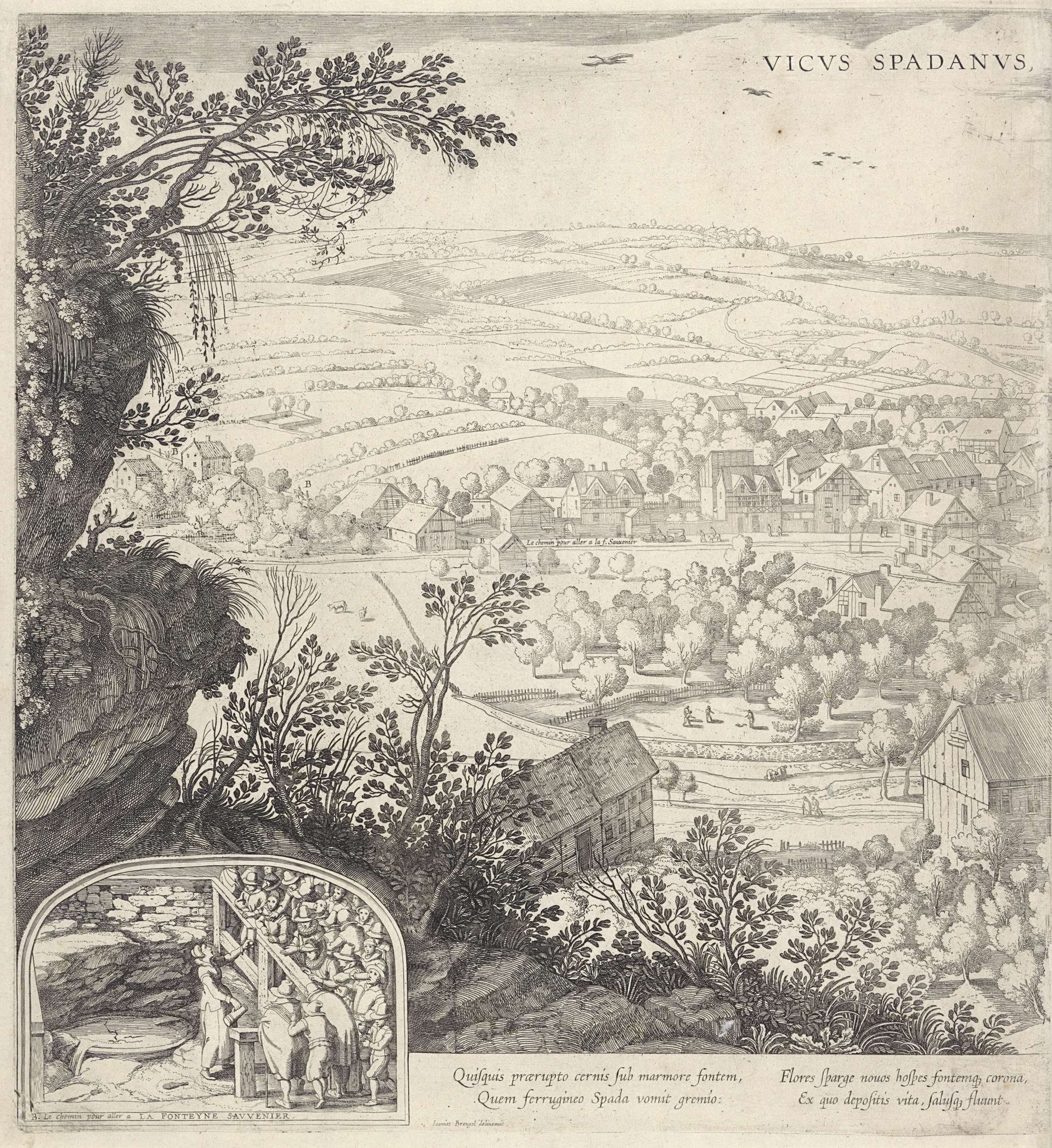 Linker blad van een gezicht op de stad Spa met de weg naar de geneeskrachtige bron (la fonteyne sauvenier) aangeduid met de letter B. Linksonder in de inzet deelt een vrouw bij de reddende bron bekers water uit aan de mensen, die achter een houten hek staan te wachten. Onderaan in de marge twee tweeregelige ...