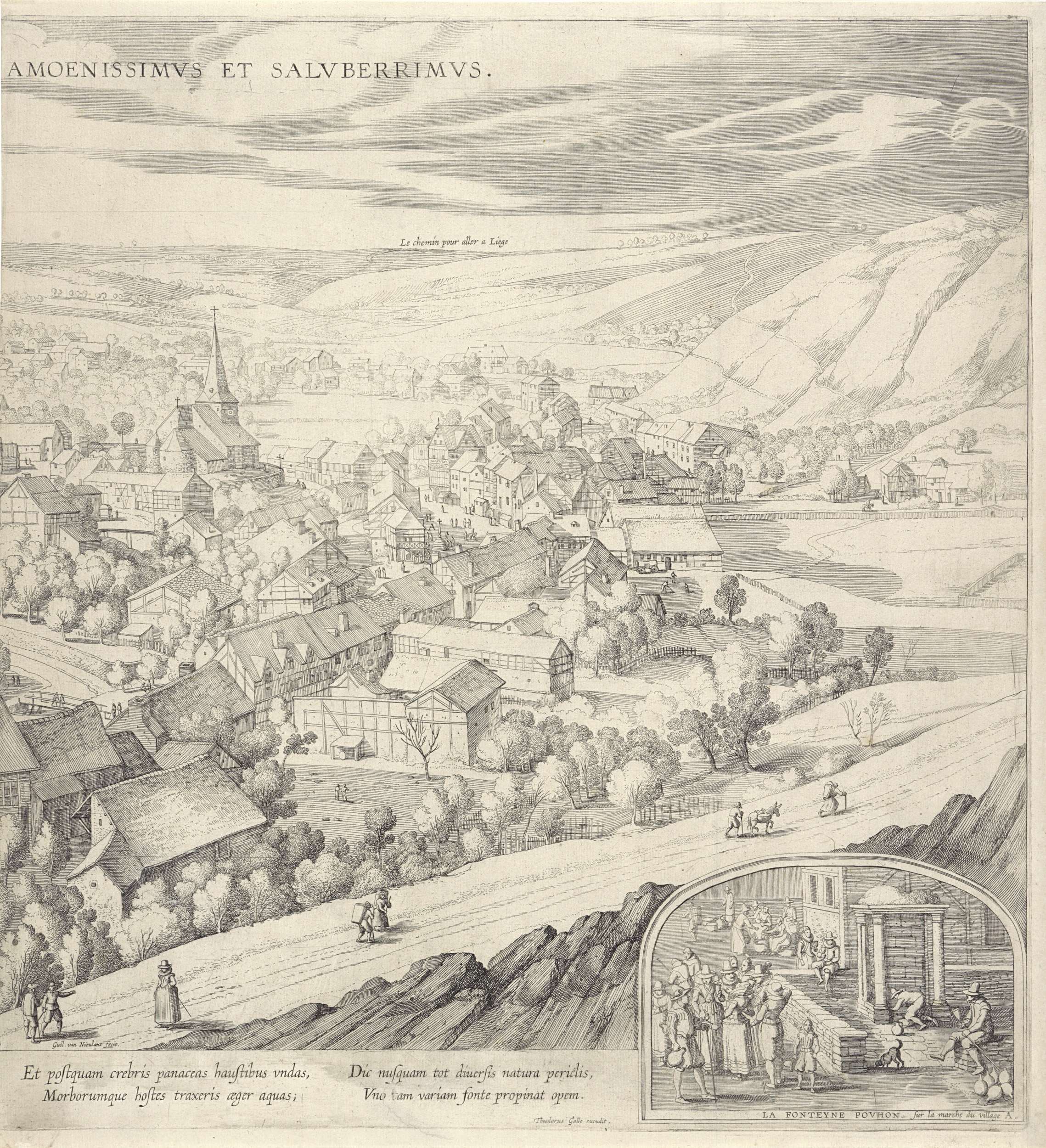 Rechter blad van een gezicht op de stad Spa met de Pouhon-bron op de markt aangeduid met de letter A. Rechtsonder in de inzet staan mensen bij de Pouhon-bron met bekers en kruiken. Onderaan in de marge twee tweeregelige verzen in het Latijn.
