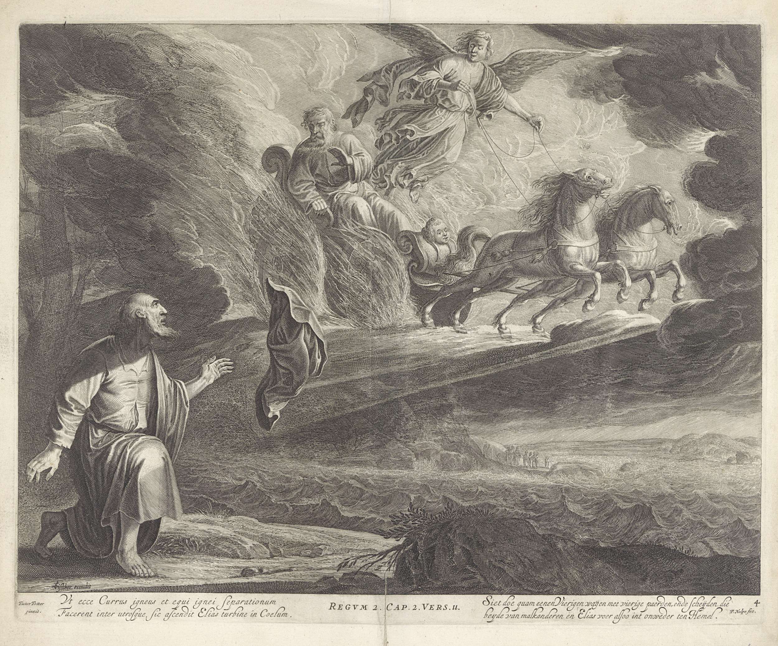 Elia rijdt in een vurige wagen, getrokken door twee paarden en bestuurd door een engel, ten hemel. Hij steekt zijn hand op naar de achtergebleven profeet Elisa en zijn mantel valt uit de wagen naar beneden. Naar de Bijbeltekst in 2 Kon. 2:11. Onderaan in de marge twee tweeregelige teksten in het Latijn en het ...