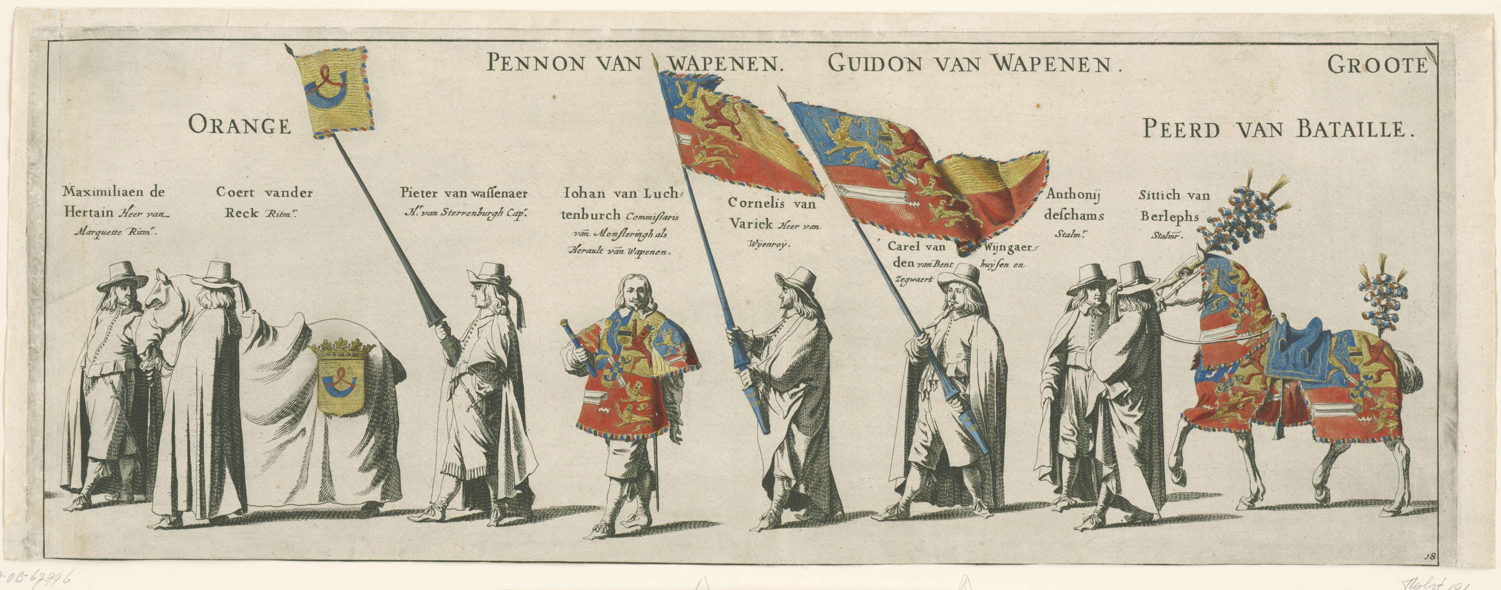 De begrafenisstoet van stadhouder Frederik Hendrik te 's-Gravenhage op 10 mei 1647. Plaat nr. 18 met een deel van de stoet met vaandeldragers en twee paarden, boven de personen staan hun naam en functie. Onderdeel van een serie van 30 platen en 20 tekstbladen, bedoeld om aan elkaar geplakt te worden.