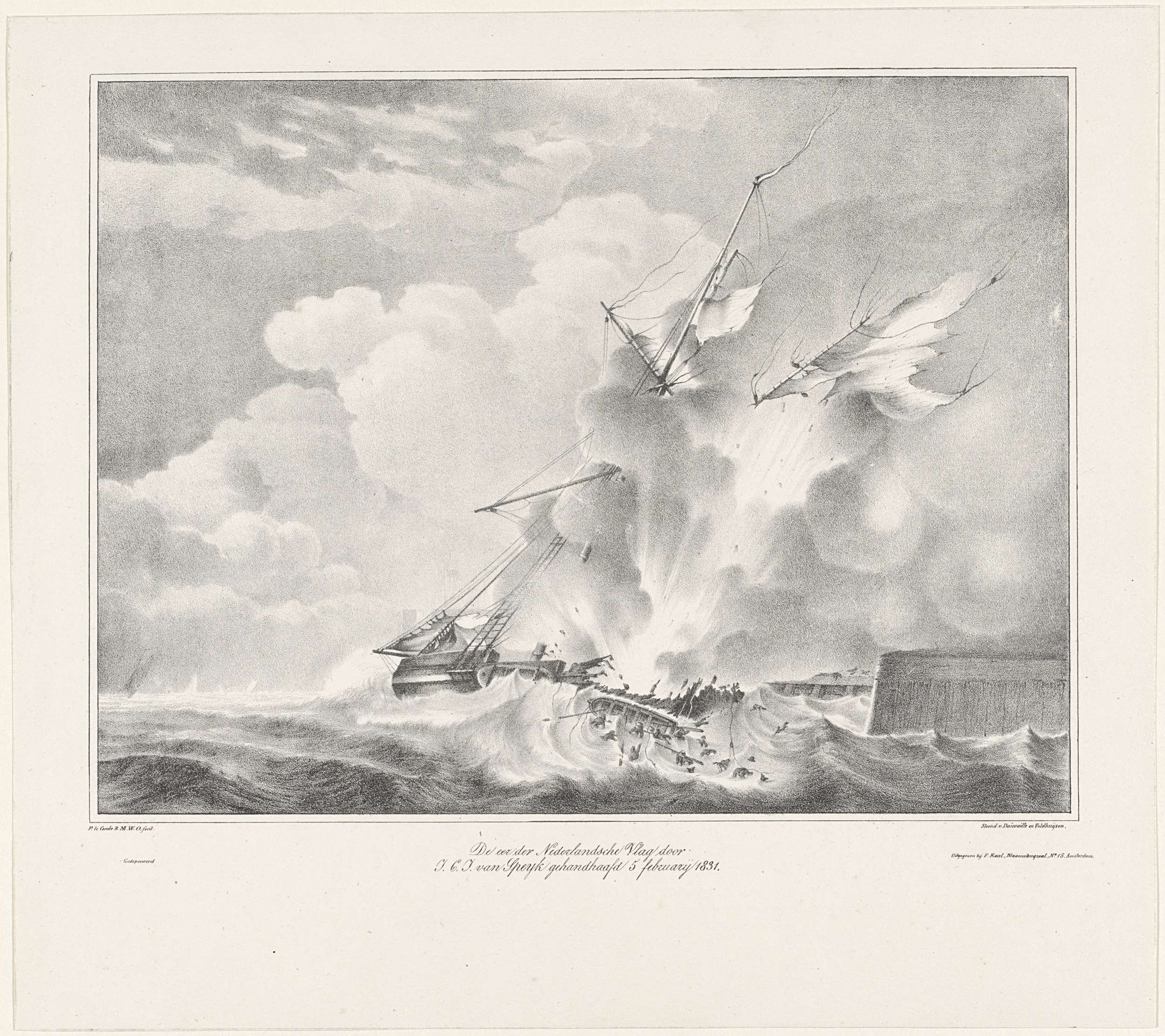 Het in de lucht springen van de kanonneerboot van Jan van Speyk, 5 februari 1831. Zie ook de pendant. Bij de beide platen behoort een tekstblad met uitlegging van de voorstelling.