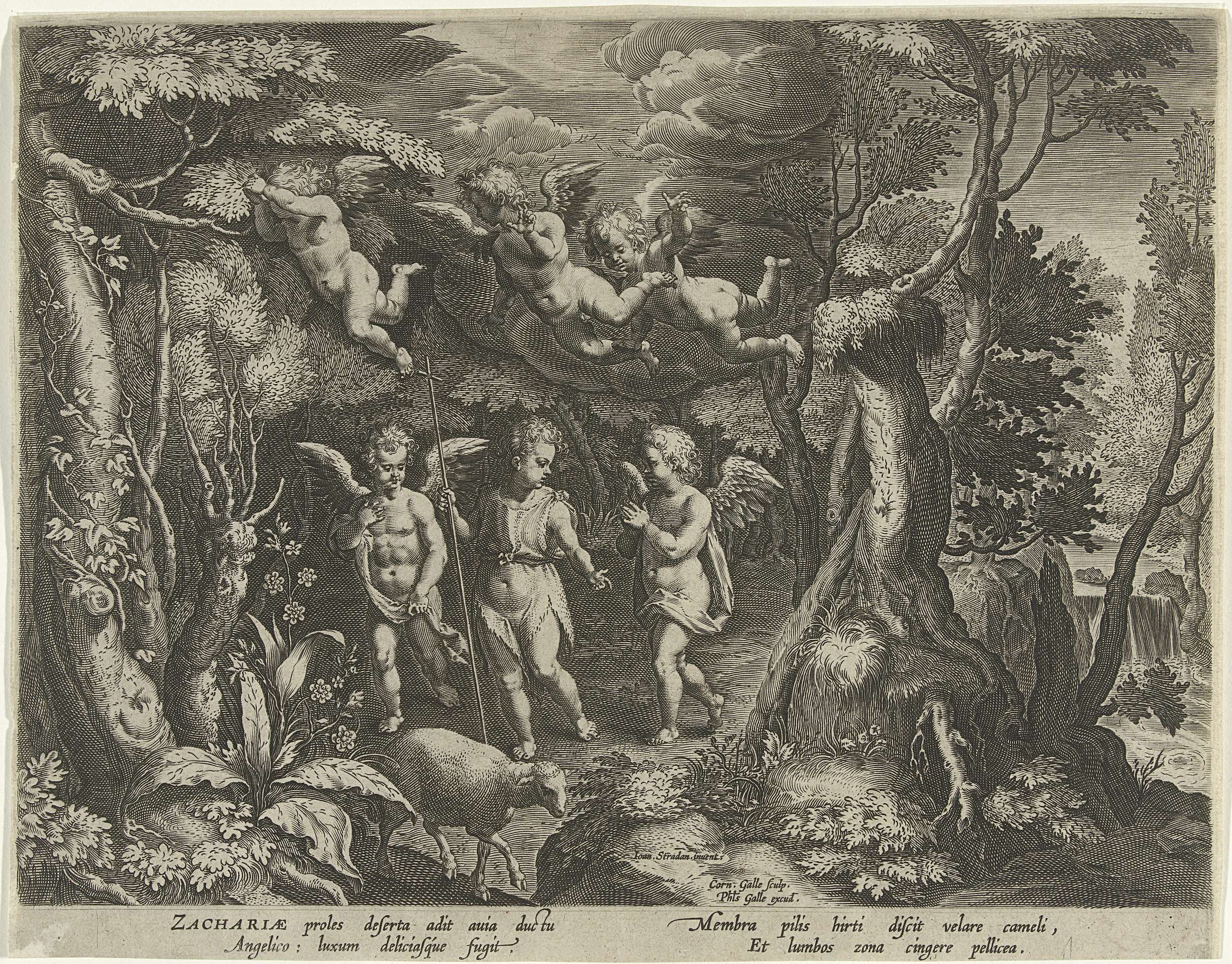 Johannes de Doper als kind, lopend met kruisvaan door een landschap, begeleid door twee engeltjes naast hem en drie boven zijn hoofd. Het lam loopt voor hem uit. Onder de voorstelling een Latijns vers.