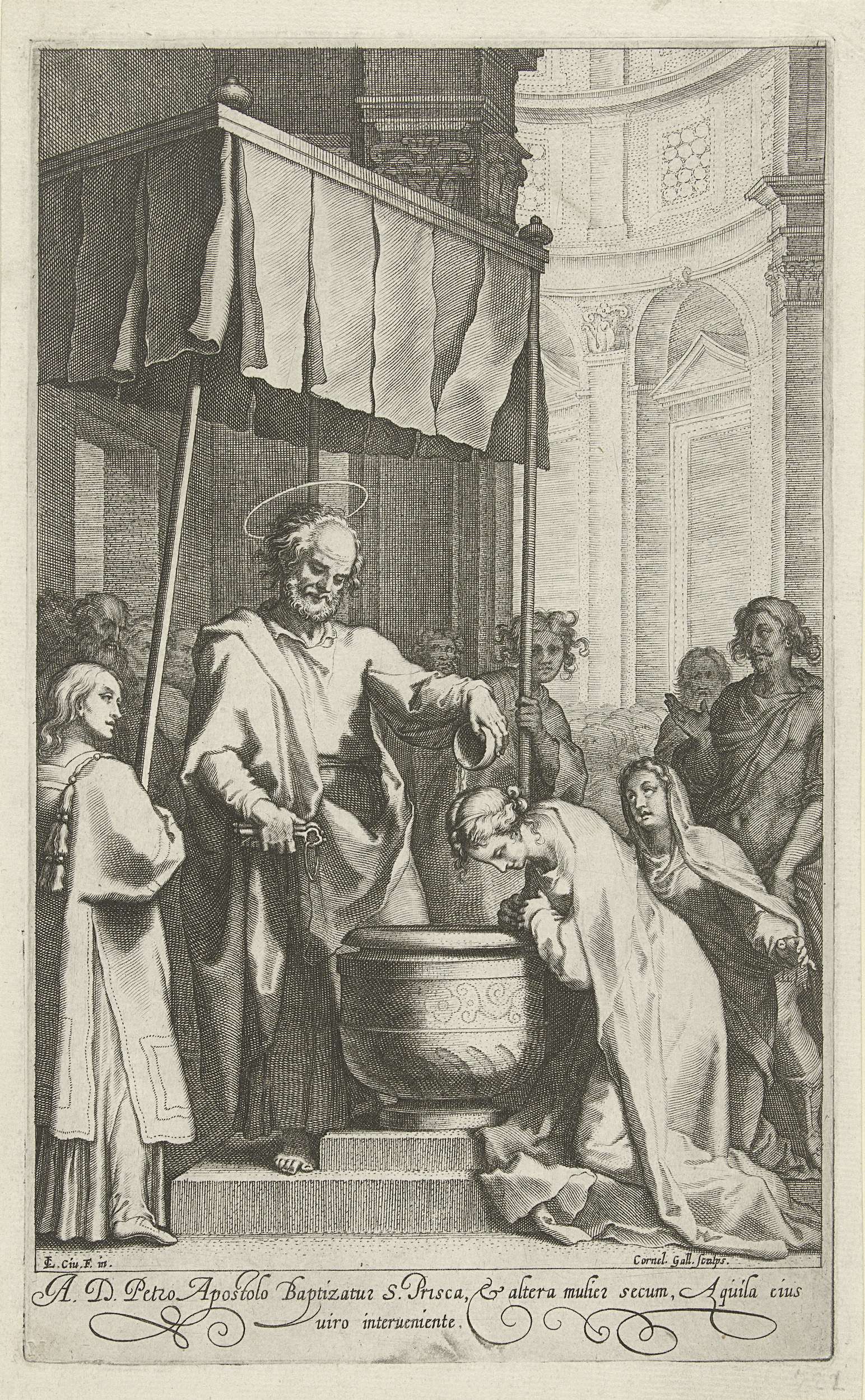 De heilige Petrus, met de sleutels in zijn hand, doopt de heilige Prisca van Rome. Prisca knielt voor een doopvont met gevouwen handen. Petrus giet uit een kommetje water over haar hoofd. Een tweede vrouw knielt achter Prisca en wacht haar beurt af.