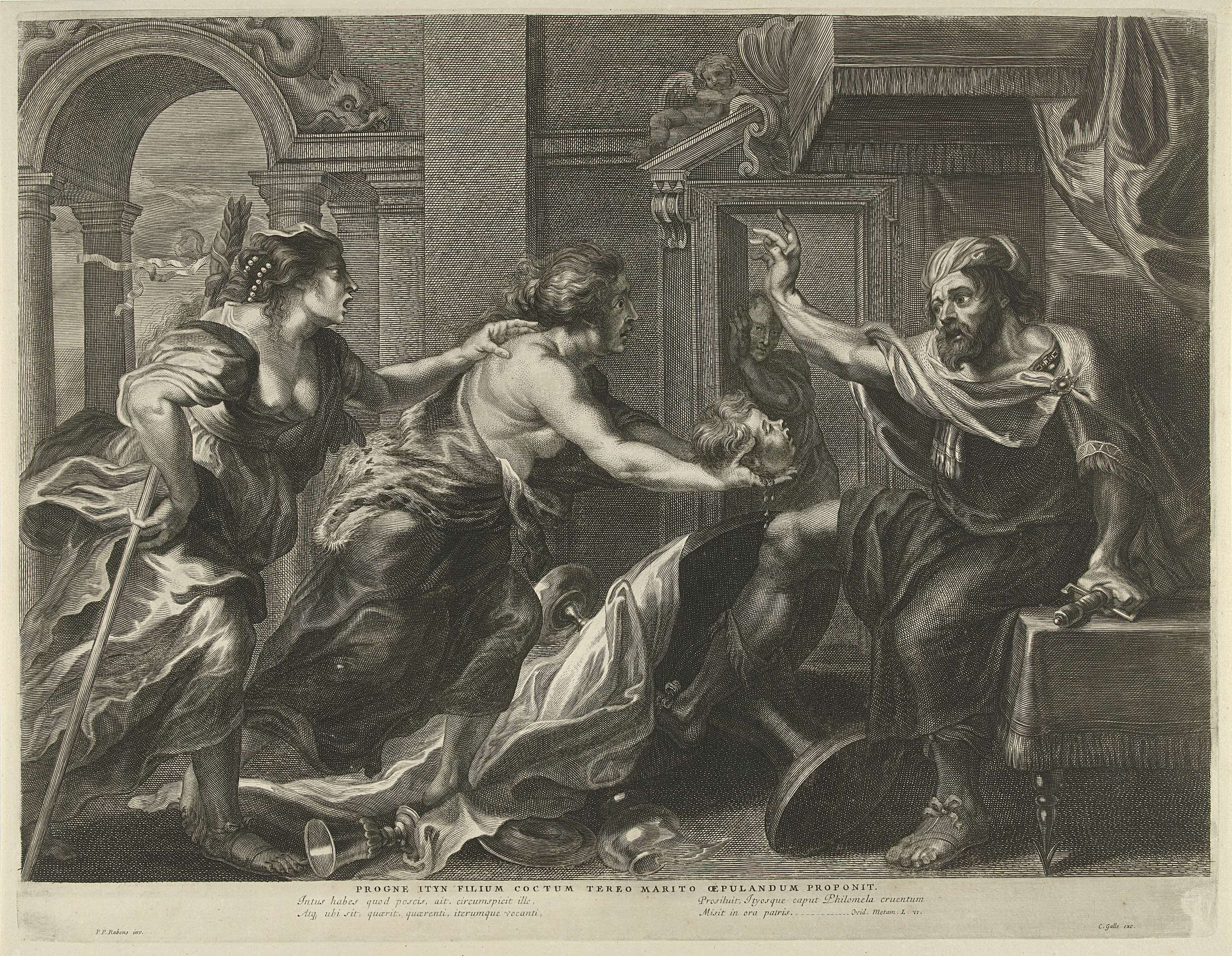 Prokne en haar zus Philomena tonen koning Tereus het hoofd van zijn dode zoon Itys om hem te bewijzen dat hij zojuist het vlees van zijn eigen zoon gegeten heeft. Tereus is woest gooit de tafel omver en trekt zijn zwaard.
