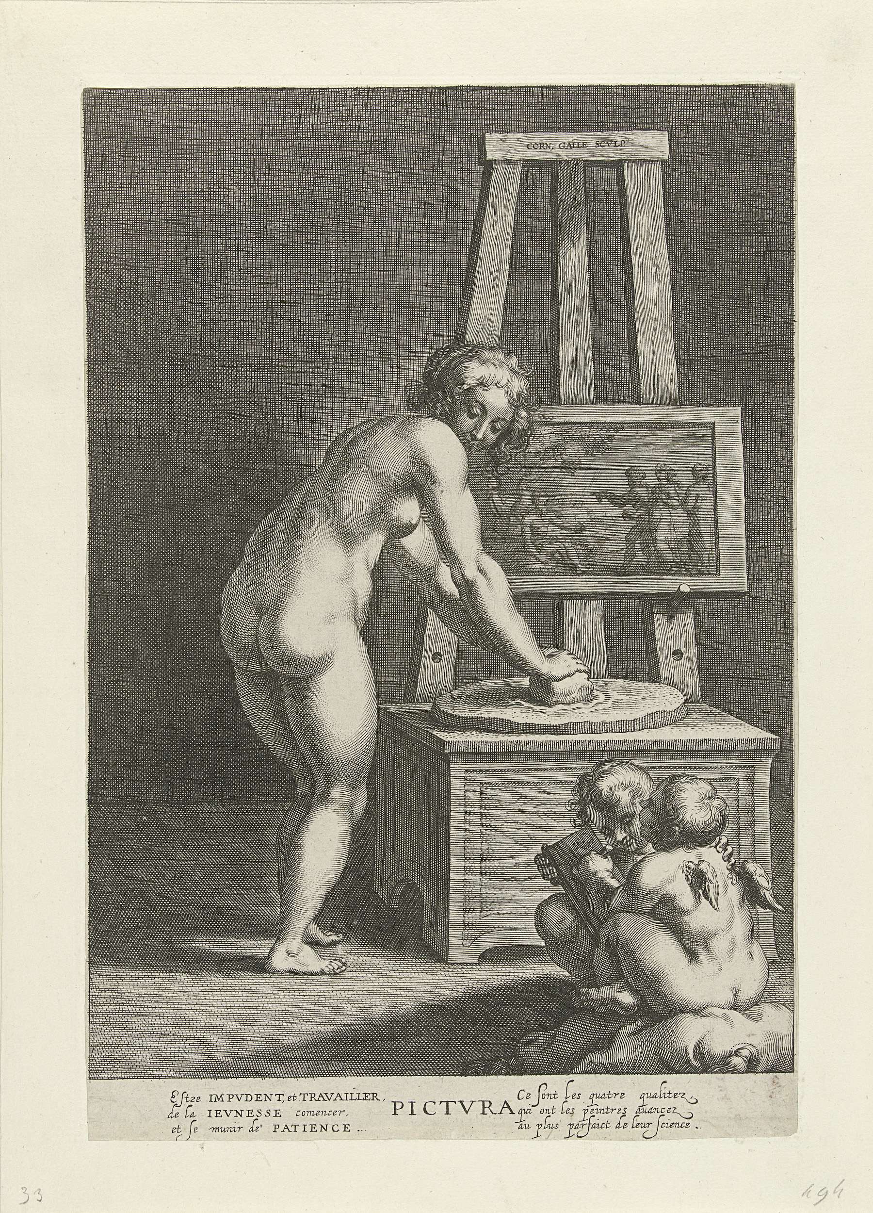 Pictura de personificatie van de schilderkunst vermaalt pigmenten in haar atelier. Op een ezel staat een schilderij. Op de grond zitten twee putti die een tekening van haar maken. Onder de voorstelling een Frans vers.