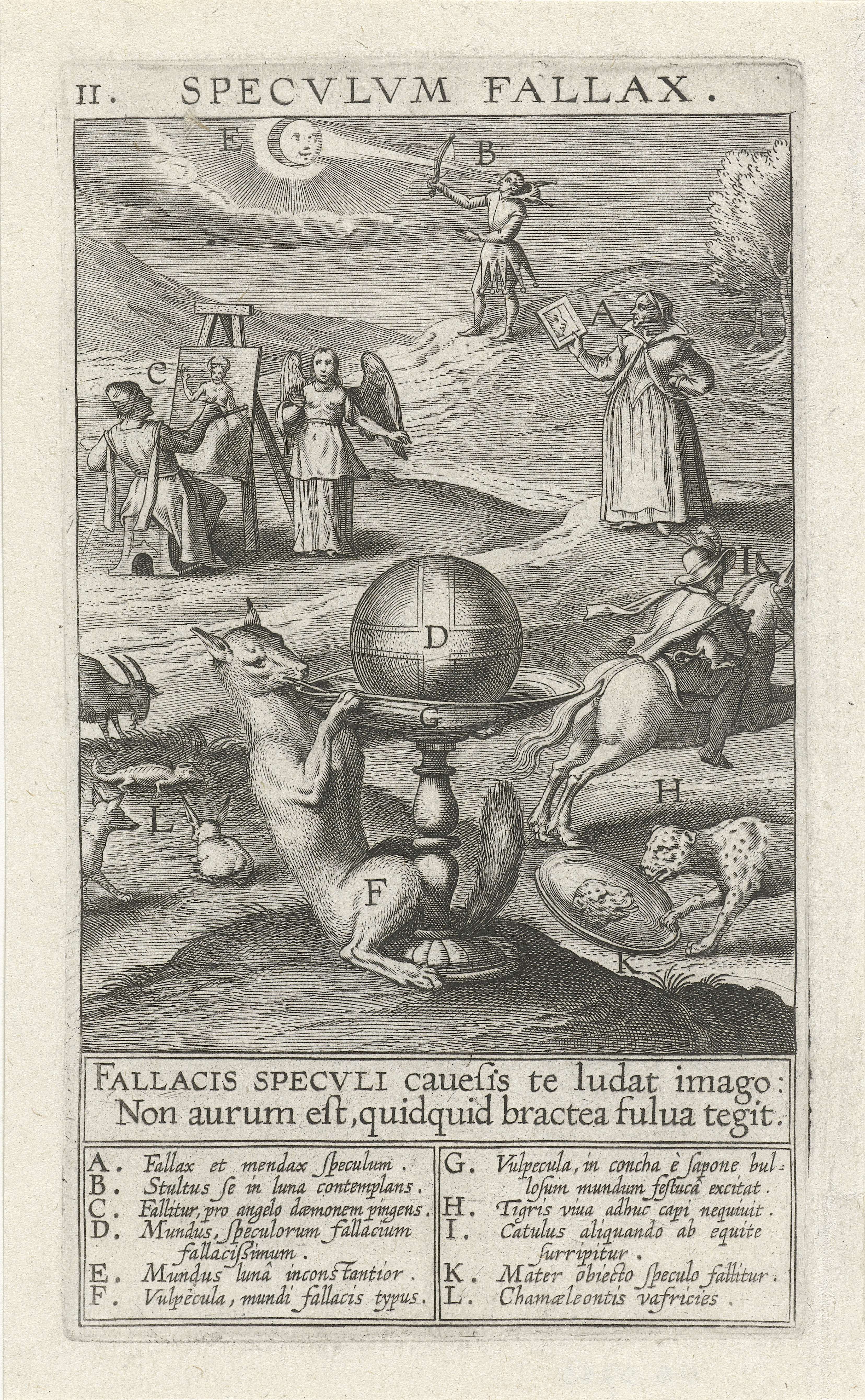 Op de voorgrond blaast een vos een zeepbel die de vorm heeft van de wereld. In de achtergrond toonbeelden van het aardse bedrog: een vrouw die in een spiegel kijkt, een nar die door een spiegel naar de maan kijkt, een schilder die een engel afbeeldt als een duivel, een kameleon. De prent heeft een ...