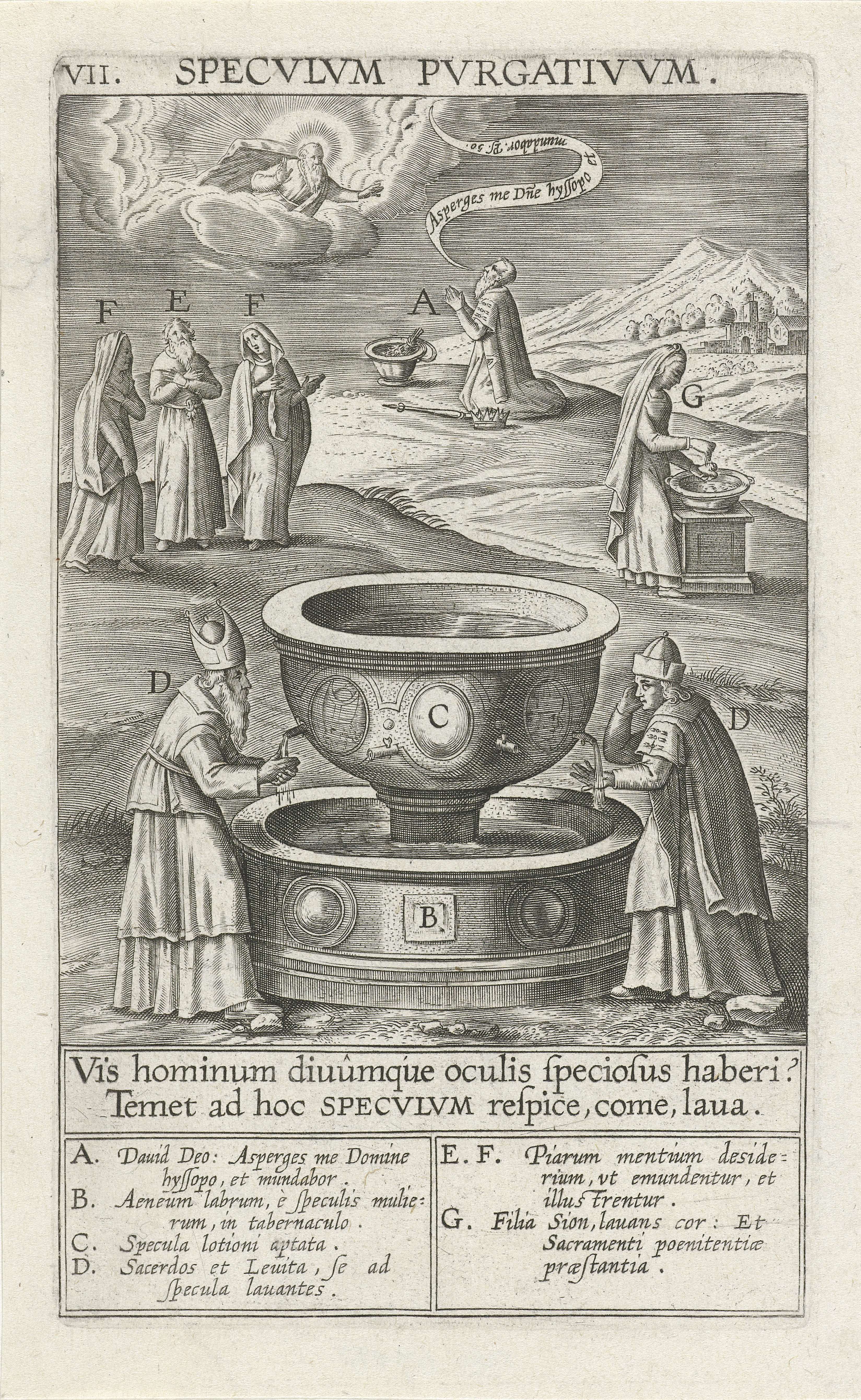 Op de voorgrond een Leviet en een priester. Ze wassen hun handen met het water van een grote fontein. In de achtergrond verschijnt God aan koning David. De prent heeft een Latijns onderschrift: 'Vis hominum diuumque oculis speciofus haberi? Temet ad hoc Specvlvm refpice, come laua'. Onderaan een legende van de scènes die op de ...