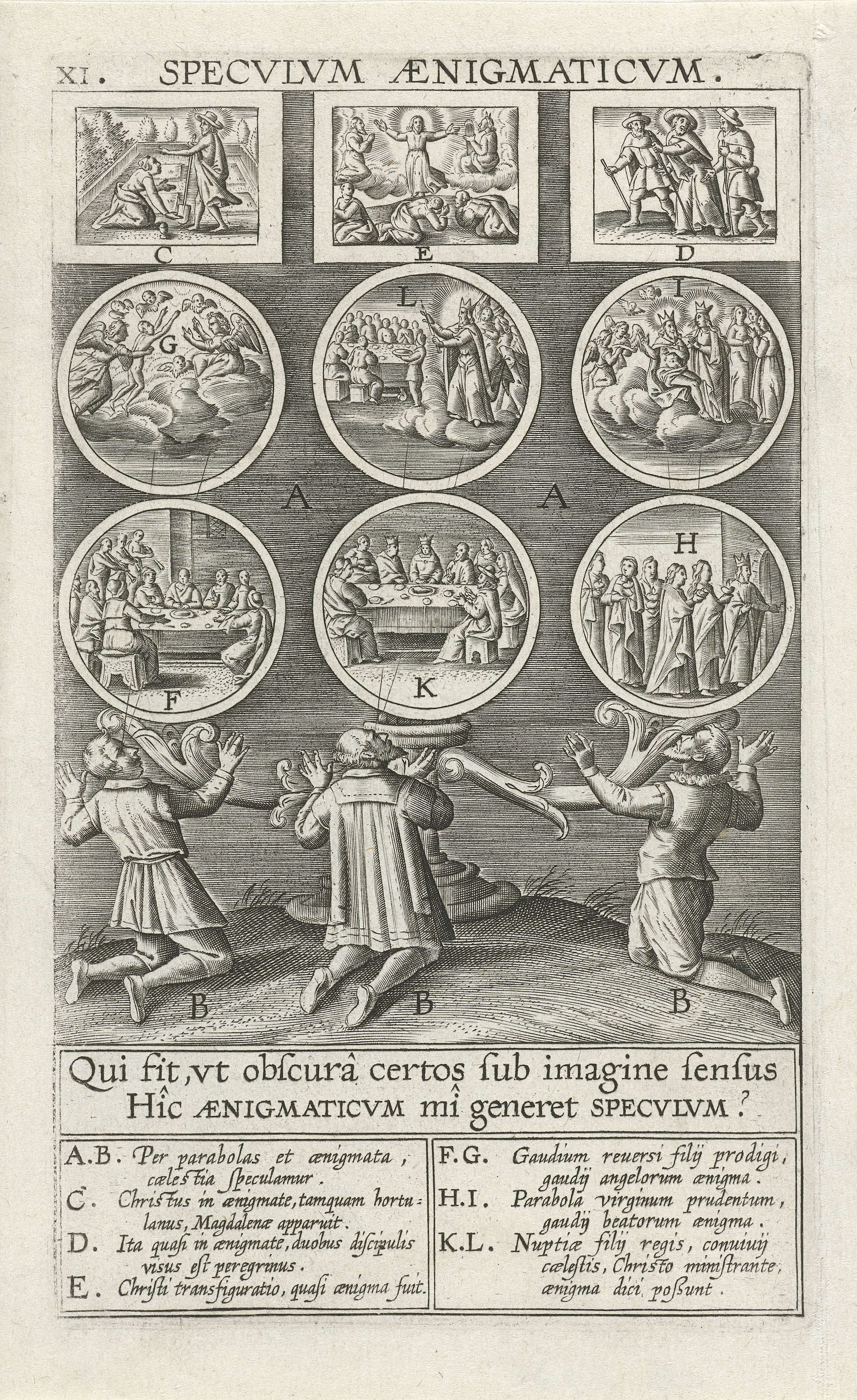 Drie gelovigen knielen voor een negendelige spiegel. De spiegels tonen toespelingen op de goddelijkheid van Christus en relateert deze aan het leven van de mens. Ondermeer afgebeeld: Christus verschijnt als hovenier aan Maria Magdalena; de Transfiguratie en de Emmaüsgangers. De prent heeft een Latijns onderschrift: 'Naturam iuvat artis opus; specvloque magistro, Praecipit arcans emaculare notas'. ...