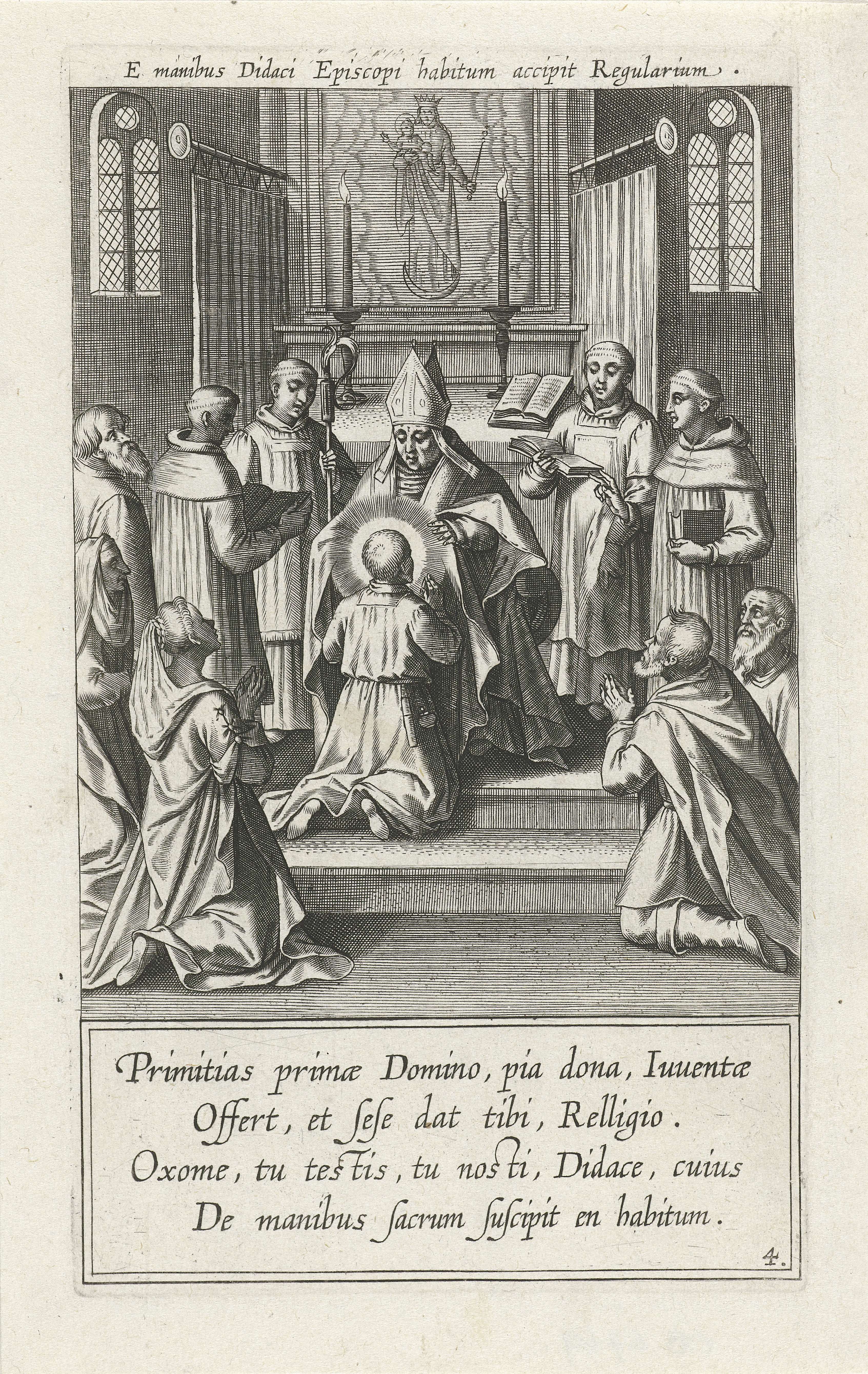 De heilige Dominicus wordt door de bisschop gewijd. De prent heeft een Latijns opschrift en onderschrift en maakt deel uit van een prentserie voor een boek over het leven van de heilige Dominicus.