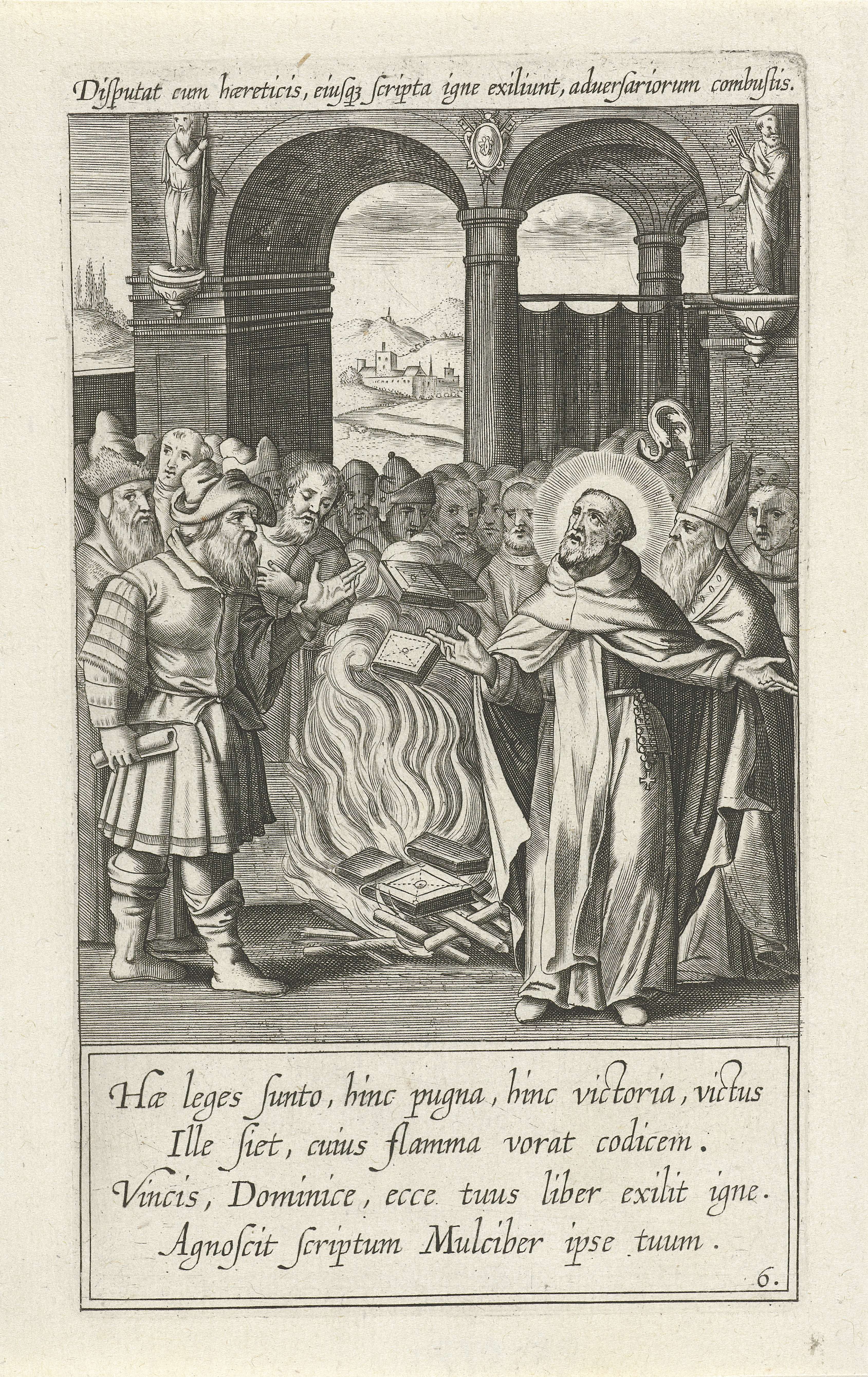 De heilige Dominicus en de ketterse leider van de Albigenzen gooien beiden hun bijbel in het vuur. De bijbel van de heilige Dominicus verbrandt niet, maar springt uit het vuur. De prent heeft een Latijns opschrift en onderschrift en maakt deel uit van een prentserie voor een boek over het leven van de heilige Dominicus.