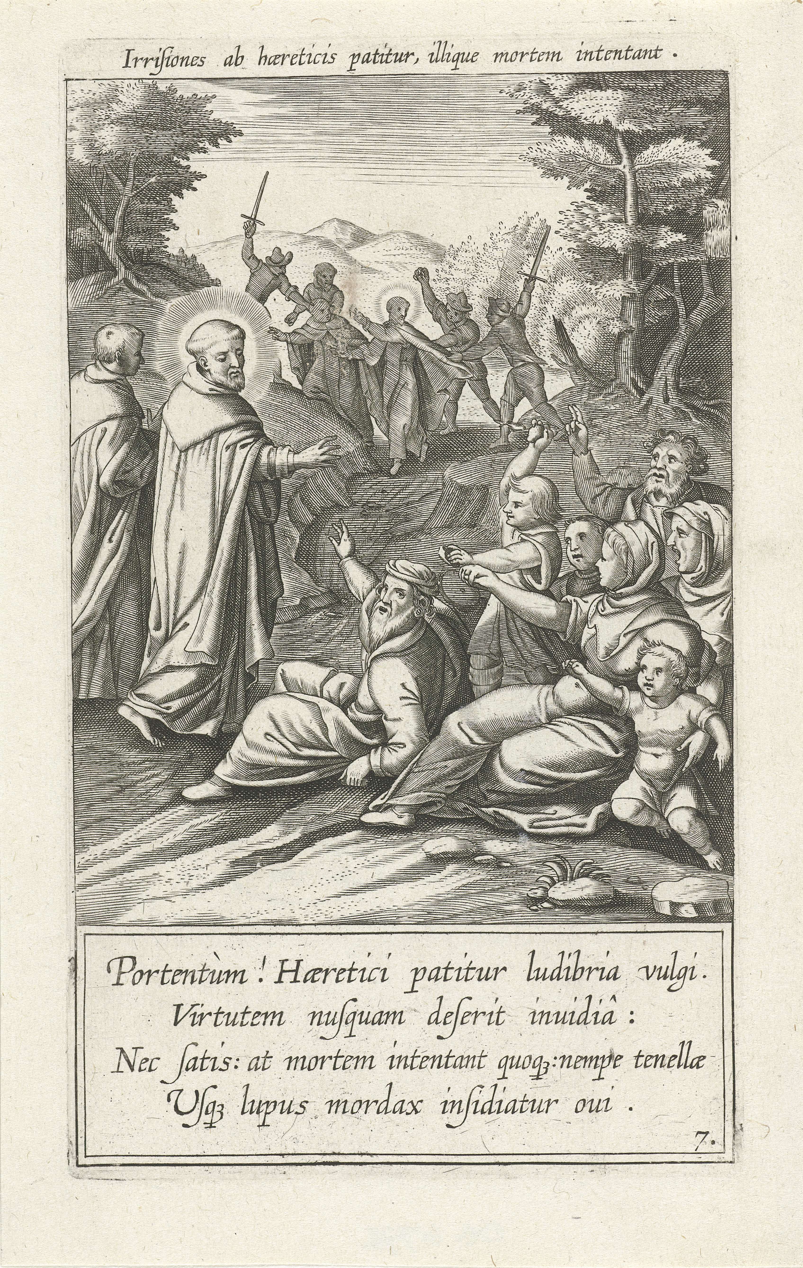 De heilige Dominicus wordt in zijn strijd tegen de Albigenzen bespot en geslagen. De prent heeft een Latijns opschrift en onderschrift en maakt deel uit van een prentserie voor een boek over het leven van de heilige Dominicus.