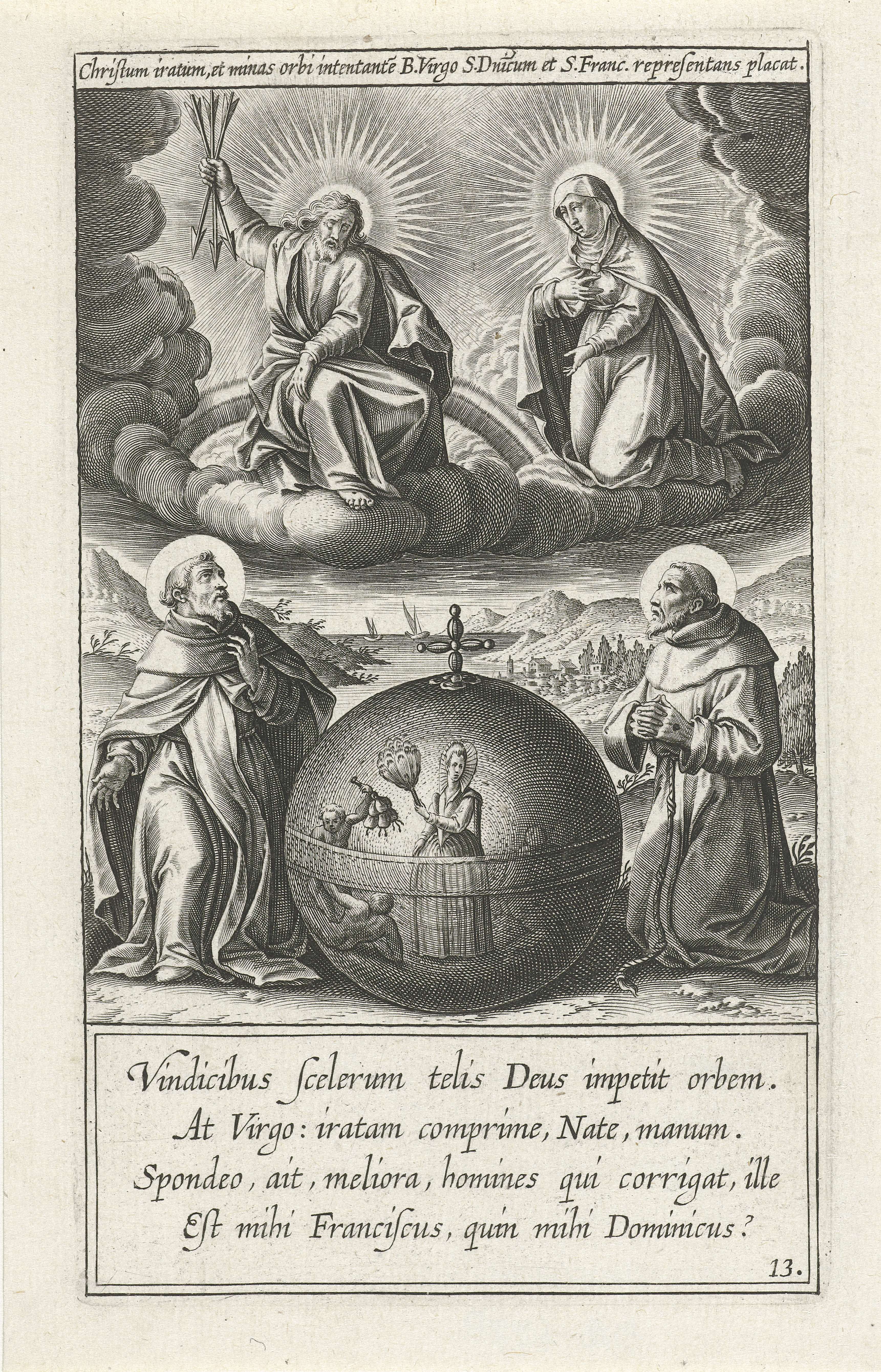 De heilige Dominicus heeft een visioen waarin Christus met drie speren de zondige wereld (een globe met de hoofdzonden) wil vernietigen. De maagd Maria smeekt hem de wereld te sparen en toont Christus de heilige Dominicus en de heilige Franciscus, die beiden geknield aan weerszijden van de globe zitten. De prent heeft een Latijns opschrift ...