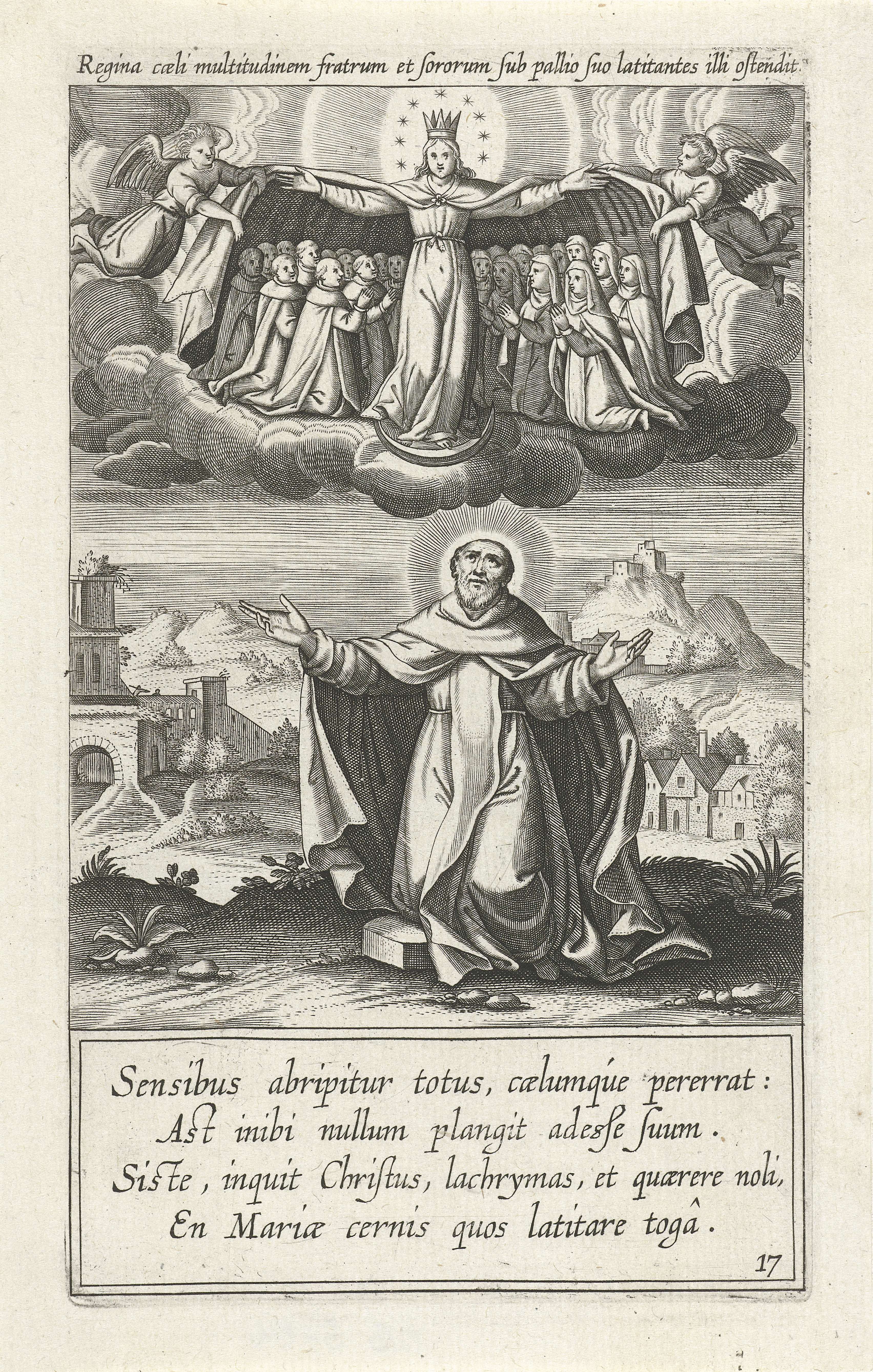 De heilige Dominicus zit geknield op de grond. Hij krijgt een visioen dat de maagd Maria zijn orde beschermt door ze met haar mantel te bedekken. De prent heeft een Latijns opschrift en onderschrift en maakt deel uit van een prentserie voor een boek over het leven van de heilige Dominicus.