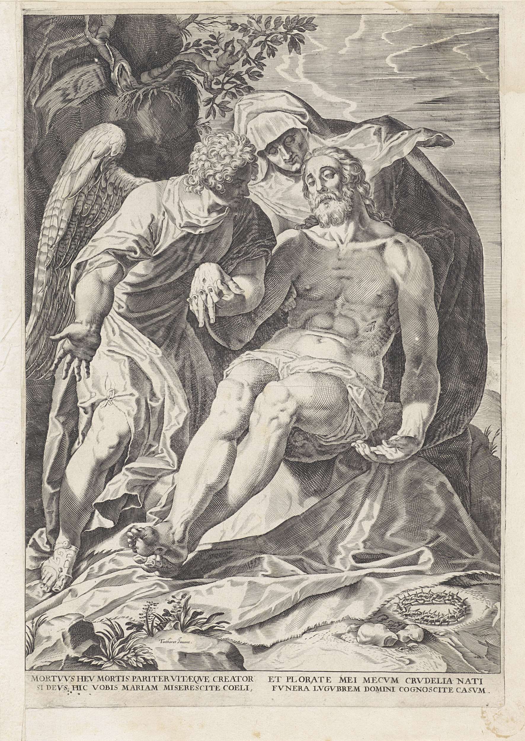 Maria ondersteunt het lichaam van Christus. Een engel houdt Christus' rechterhand vast. Rechtsvoor ligt de doornenkroon op de grond. Onder in de marge een vierregelig onderschrift in het Latijn.